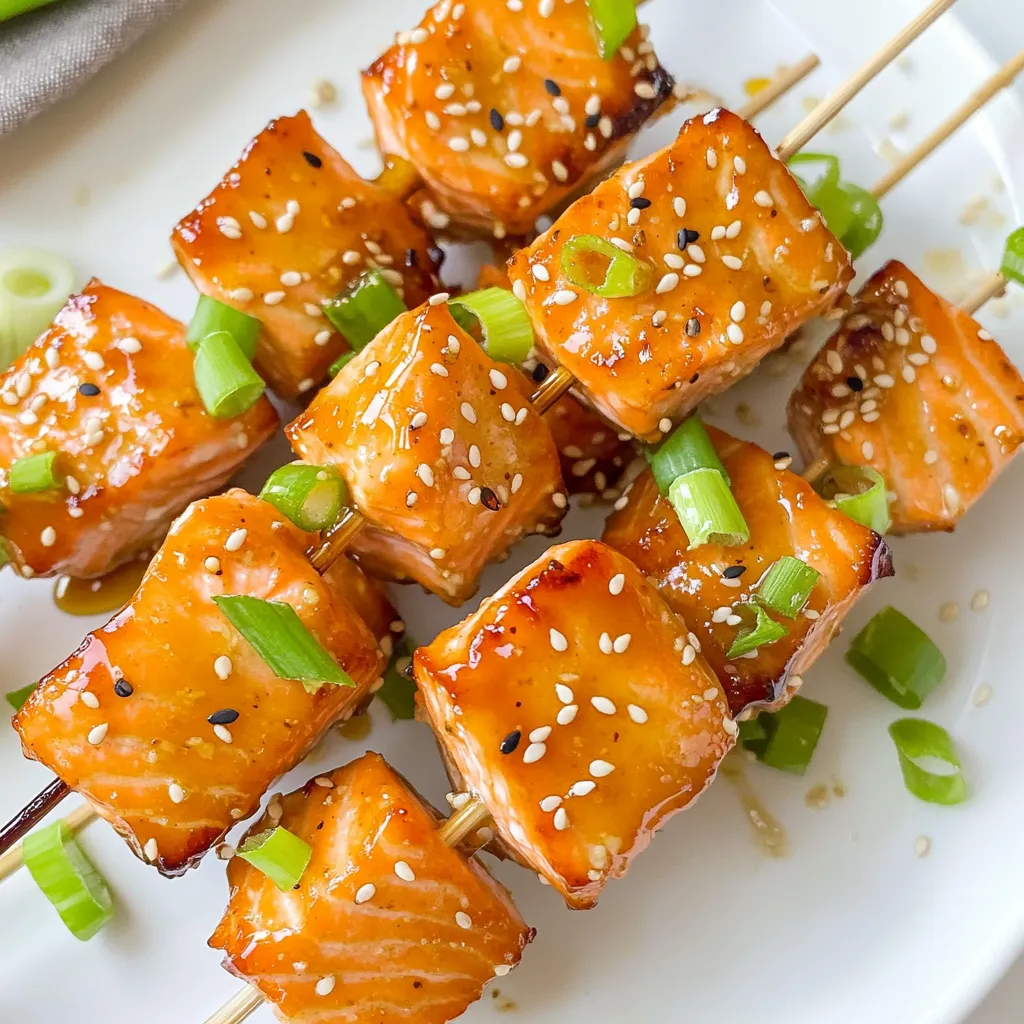 Heize die Luftfritteuse auf 200°C vor. Lege die Spieße in den Korb, aber überfülle ihn nicht. Gare die Spieße für 8 bis 10 Minuten. Wende sie zur Hälfte der Garzeit. Der Lachs ist fertig, wenn er sich leicht mit einer Gabel zerteilen lässt. Nimm die Spieße vorsichtig heraus. Garniere sie mit Sesamsamen und geschnittenen Frühlingszwiebeln. So sieht das Gericht noch schöner aus.