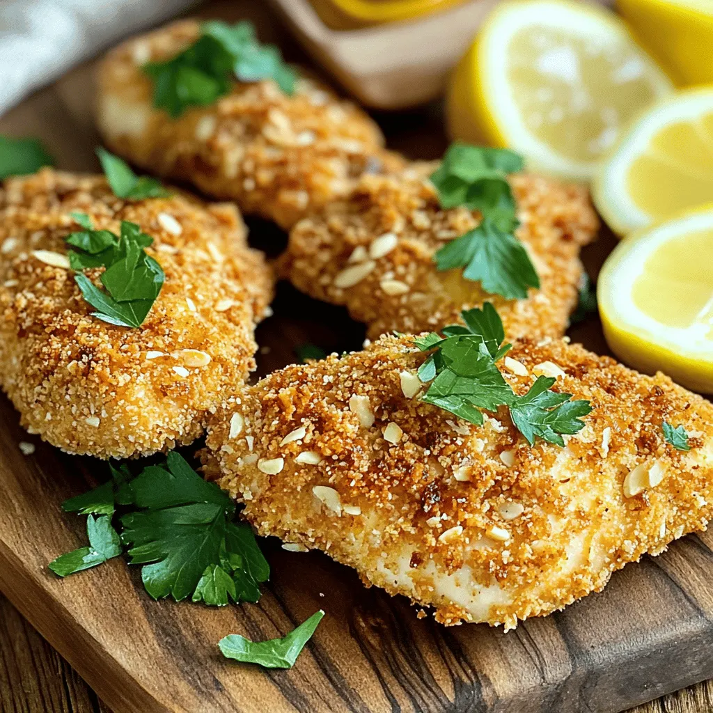 ![- 450 g Hähnchentender - 100 g Mandelmehl - 50 g Semmelbrösel (vorzugsweise Vollkorn) Die Hauptzutaten sind wichtig für den Geschmack und die Textur. Die Hähnchentender sind zart und saftig. Mandelmehl gibt den Nuggets einen nussigen Geschmack. Die Semmelbrösel sorgen für die knusprige Kruste, die wir alle lieben. - 1 Esslöffel Dijon-Senf - 1 Teelöffel Knoblauchpulver - 2 Esslöffel Olivenöl (zum Braten) Die Gewürze machen die Hähnchentender lebendig. Dijon-Senf hilft, die Kruste zu binden und gibt einen tollen Geschmack. Knoblauchpulver fügt eine schöne Tiefe hinzu. Olivenöl ist das beste Öl zum Braten. Es macht die Nuggets goldbraun und knusprig. - Frische Petersilie, gehackt (zum Garnieren) - Zitronenscheiben Die Garnierung macht das Gericht ansprechend. Frische Petersilie bringt Farbe und Aroma. Zitronenscheiben sorgen für einen frischen Kick. Diese einfachen Zutaten machen das Gericht noch leckerer und schöner. Für die vollständige Anleitung, schau dir das Rezept [Full Recipe] an. Heize den Ofen auf 200°C vor. Dies sorgt für eine gleichmäßige Garung. Lege ein Backblech mit Backpapier aus. So bleibt das Hühnchen nicht kleben und die Reinigung wird leichter. In einer flachen Schüssel mische 100 g Mandelmehl, 50 g Semmelbrösel, 1 Teelöffel Knoblauchpulver, 1 Teelöffel Zwiebelpulver, 1 Teelöffel Paprika, Salz und Pfeffer. Vermenge alles gut, bis die Mischung einheitlich aussieht. In einer separaten Schüssel verquirle 2 große Eier mit 1 Esslöffel Dijon-Senf. Diese Eimischung hilft, die Kruste später gut haften zu lassen. Tauche jeden Hähnchentender zuerst in die Eimischung. Lass überschüssige Flüssigkeit abtropfen. Danach tauche den Hähnchentender in die Mandelmehlmischung. Drücke leicht, damit die Panade gut haftet. Dieser Schritt ist wichtig für die perfekte Knusprigkeit. Die Garzeit für Mandel-Krusten-Hühnchen-Nuggets ist wichtig. Braten Sie die Hähnchentender etwa drei Minuten pro Seite. So bleiben sie saftig. Nach dem Braten legen Sie sie auf ein Backblech. Backen Sie sie bei 200°C für 10-12 Minuten. Die Innentemperatur sollte 75°C erreichen. Nutzen Sie ein Fleischthermometer, um sicherzustellen, dass sie gar sind. Um die Kruste besonders knusprig zu machen, verwenden Sie frisches Mandelmehl. Mischen Sie es gut mit den Semmelbröseln. Achten Sie darauf, dass die Hähnchentender gleichmäßig bedeckt sind. Lassen Sie das überschüssige Ei abtropfen, bevor Sie in die Kruste tauchen. Vermeiden Sie es, die Panade zu drücken. So bleibt sie locker und knusprig. Präsentieren Sie die Hühnchen-Nuggets auf einem schönen Holzbrett. Das sieht appetitlich aus. Fügen Sie eine kleine Schale Honigsenf oder Ranch-Dressing hinzu. Diese Dips passen perfekt zu den Nuggets. Garnieren Sie das Gericht mit frischen Kräutern und Zitronenscheiben. So wird es noch einladender. Wenn Sie mehr Ideen suchen, schauen Sie sich den Full Recipe an. {{image_4}} Für eine glutenfreie Variante der Mandel-Krusten-Hühnchen-Nuggets verwenden Sie glutenfreie Brösel. Diese sind in vielen Geschäften erhältlich. Sie können auch Panko-Brösel verwenden, um einen extra Crunch zu erzielen. Alternativ zu Mandelmehl können Sie Kokosmehl oder eine Mischung aus Reismehl und Kartoffelstärke nutzen. Diese Optionen sind leicht und bieten einen besonderen Geschmack. Um Ihren Hähnchentendern mehr Geschmack zu verleihen, fügen Sie zusätzliche Gewürze hinzu. Zum Beispiel können Sie italienische Kräuter wie Oregano oder Thymian verwenden. Diese verbessern den Geschmack der Kruste. Auch Käse wie Parmesan oder Cheddar kann in die Krustenmischung gegeben werden. Frische Kräuter wie Petersilie oder Basilikum sorgen für eine frische Note. Zu den Mandel-Krusten-Hühnchen-Nuggets passen viele Beilagen gut. Ein frischer Salat mit Zitronen-Dressing ergänzt die Nuggets perfekt. Auch gebratene Gemüse oder Kartoffelpüree sind tolle Optionen. Für Getränke empfehle ich einen leichten Weißwein oder einen spritzigen Apfelsaft. Diese Getränke runden das Essen perfekt ab. Bewahre die Mandel-Krusten-Hühnchen-Nuggets in einem luftdichten Behälter auf. Sie halten sich im Kühlschrank etwa drei bis vier Tage. Wenn du sie länger aufbewahren möchtest, friere sie einfach ein. Im Gefrierschrank bleiben sie bis zu drei Monate frisch. Achte darauf, sie gut zu verpacken, um Gefrierbrand zu vermeiden. Um die Nuggets wieder aufzuwärmen, benutze den Ofen oder die Pfanne. Heize den Ofen auf 180°C vor. Lege die Nuggets auf ein Backblech und erhitze sie etwa 10-15 Minuten. Dadurch bleiben sie knusprig. In einer Pfanne kannst du etwas Öl erhitzen und die Nuggets für 3-4 Minuten auf jeder Seite braten. So werden sie warm und lecker. Vermeide es, sie in der Mikrowelle aufzuwärmen. Das macht sie oft weich und gummig. Achte darauf, dass die Nuggets beim Aufwärmen nicht austrocknen. Wenn du sie im Ofen oder in der Pfanne aufwärmst, bleiben sie schön saftig. Für Mandel-Krusten-Hühnchen-Nuggets benötigst du frische Hähnchentender. Diese werden zuerst in einer Eimischung getaucht, dann in einer Mischung aus Mandelmehl und Semmelbröseln gewälzt. So entsteht die knusprige Kruste. Brate die Nuggets in einer Pfanne, bis sie goldbraun sind. Danach backst du sie im Ofen, um sie durchzugaren. Du findest das vollständige Rezept weiter oben. Ja, du kannst die Hähnchentender auch im Ofen zubereiten. Heize den Ofen auf 200°C vor. Lege die panierten Hähnchentender auf ein Backblech. Backe sie etwa 15 bis 20 Minuten, bis sie goldbraun sind. Überprüfe die Innentemperatur, sie sollte 75°C erreichen. So bleiben die Nuggets schön knusprig. Zu den Hähnchentendern passen viele Dips. Honigsenf ist eine beliebte Wahl. Ranch-Dressing bietet eine cremige Note. Auch BBQ-Sauce oder süß-scharfe Saucen sind großartige Optionen. Die Wahl des Dips kann das Geschmackserlebnis stark beeinflussen. Das Rezept ergibt vier Portionen. Ideal für eine kleine Familie oder ein Treffen mit Freunden. Du kannst die Meng