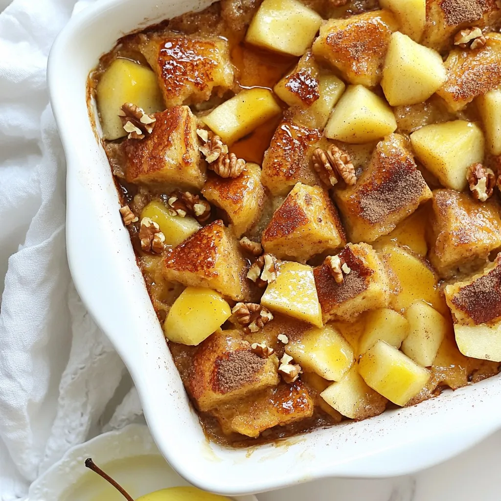 Jetzt ist es Zeit für das Brot. Nimm deinen Brotlaib vom Vortag und schneide ihn in Würfel. Es ist wichtig, sie gleichmäßig zu schneiden. Füge die Brotwürfel zu der Eiermischung hinzu. Hebe sie vorsichtig unter die Mischung, bis alle Stücke gut bedeckt sind. Nun kommen die Äpfel. Die gewürfelten Äpfel, vorzugsweise Granny Smith, passen perfekt. Wenn du magst, füge 1/2 Tasse gehackte Walnüsse oder Pekannüsse hinzu. Sie geben eine schöne Textur.