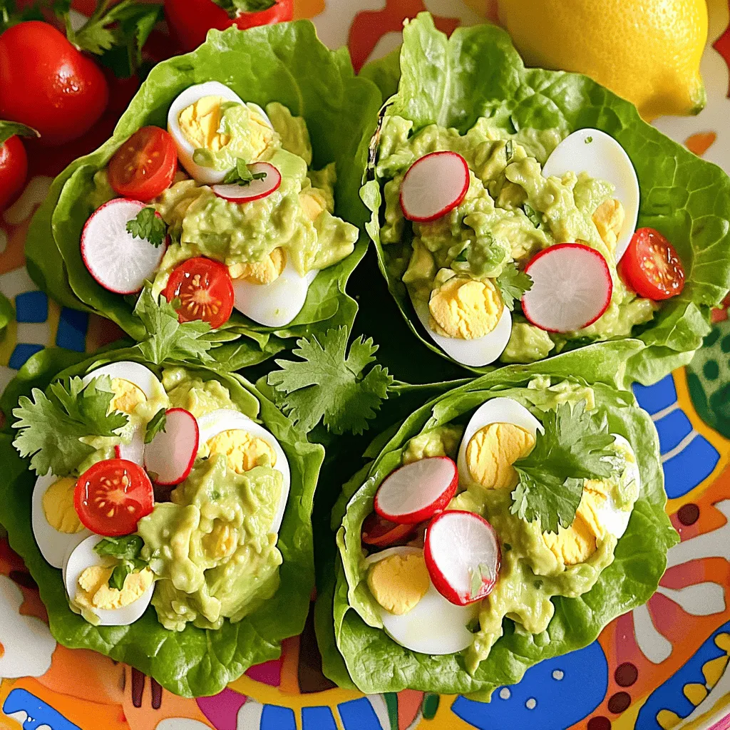 ![- 4 große Eier, hartgekocht und grob gehackt - 1 reife Avocado, cremig püriert - 2 Esslöffel griechischer Joghurt - 1 Teelöffel Dijon-Senf - 1 Esslöffel frischer Zitronensaft - 2 Esslöffel frischer Koriander, gehackt - Salz und Pfeffer nach Geschmack - 8 große Blätter Salat (Römersalat oder Buttersalat eignen sich hervorragend) Die Hauptzutaten bilden die Basis für den Avocado-Ei-Salat. Die Eier liefern viel Protein, während die Avocado gesunde Fette bietet. Griechischer Joghurt macht die Mischung cremig und leicht. Dijon-Senf bringt einen pikanten Geschmack. Zitronensaft sorgt für Frische, und Koriander fügt eine schöne Kräuternote hinzu. - Cherry-Tomaten, halbiert (zur Dekoration) - In Scheiben geschnittene Radieschen (zur Dekoration) Die Dekoration macht das Gericht noch appetitlicher. Die bunten Cherry-Tomaten bringen Farbe und Süße. Radieschen bieten einen knackigen Kontrast. Römersalat oder Buttersalat sind perfekt, um die Füllung zu halten und geben einen knackigen Biss. Für das vollständige Rezept, schauen Sie sich die [Full Recipe] an. Zuerst kochen Sie die Eier hart. Lassen Sie sie abkühlen, dann hacken Sie sie grob. Nehmen Sie die reife Avocado und pürieren Sie sie, bis sie cremig ist. Bereiten Sie die Gewürze vor, indem Sie den griechischen Joghurt, Dijon-Senf und Zitronensaft bereithalten. Geben Sie die gehackten Eier und das pürierte Avocadofleisch in eine große Schüssel. Vermengen Sie die Zutaten gut miteinander. Fügen Sie dann den Joghurt, Senf und Zitronensaft hinzu. Rühren Sie sanft, bis alles gut vermischt ist. Jetzt kommt der gehackte Koriander dazu. Schmecken Sie den Salat mit Salz und Pfeffer ab. Nehmen Sie die großen Salatblätter und legen Sie sie flach hin. Geben Sie eine großzügige Menge der Salatfüllung in die Mitte jedes Blattes. Falten Sie die Seiten des Blattes über die Füllung und rollen Sie es auf. Wiederholen Sie das mit den restlichen Blättern und der Eiersalat-Mischung. Arrangieren Sie die Wraps auf einer Servierplatte. Garnieren Sie sie mit halbierten Cherry-Tomaten und Radieschenscheiben für einen bunten Akzent. Für das vollständige Rezept werfen Sie einen Blick auf den Abschnitt „Vollständiges Rezept“. Um die Avocado-Ei-Salat-Wraps schön zu präsentieren, gibt es viele kreative Ideen. Serviere die Wraps auf einem bunten Tablett. Du kannst die Wraps noch frischer machen, indem du etwas zusätzlichen Zitronensaft darüber träufelst. Für einen eleganten Touch füge essbare Blüten hinzu. Diese Blüten verleihen den Wraps nicht nur Farbe, sondern sind auch essbar und gesund. Du kannst viele Zutaten zu den Wraps hinzufügen. Füge etwas gewürfelte Paprika oder frische Gurken für zusätzlichen Crunch hinzu. Wenn du es scharf magst, probiere ein wenig Chili oder Jalapeños. Für vegane Optionen kannst du die Eier durch Kichererbsen ersetzen. Auch der griechische Joghurt kann durch pflanzliche Alternativen ersetzt werden. So bleibt der Salat lecker und passt zu verschiedenen Ernährungsweisen. Für die vollständige Rezeptanleitung, schaue dir das [Full Recipe] an. {{image_4}} Um die Avocado-Ei-Salat-Wraps frisch zu halten, wähle den richtigen Behälter. Verwende luftdichte Behälter aus Glas oder Kunststoff. Diese halten die Wraps länger frisch. Lege die Wraps am besten mit Frischhaltefolie ein, um Luftkontakt zu vermeiden. Das hilft, die Avocado vor dem Braunwerden zu schützen. Ein zusätzlicher Tipp: Lege ein Stück Küchenpapier in den Behälter. Dieses absorbiert Feuchtigkeit und sorgt für eine bessere Frische. Die Wraps halten im Kühlschrank etwa zwei bis drei Tage. Achte darauf, sie gut verpackt zu lagern. Wenn du Reste hast, verwende sie schnell. Du kannst die Füllung auch als Brotaufstrich nutzen. So bleibt nichts übrig und du genießt die leckeren Aromen erneut. Vermeide es, die Wraps einzufrieren. Die Textur verändert sich und wird nicht mehr so gut. Die Avocado-Ei-Salat-Wraps halten sich gut im Kühlschrank. Sie bleiben frisch für etwa 2 bis 3 Tage. Um die Wraps optimal zu lagern, lege sie in einen luftdichten Behälter. Das schützt sie vor Luft und Feuchtigkeit. Du kannst auch ein Blatt Küchenpapier zwischen die Wraps legen. Das hilft, die Wraps trocken zu halten und sie frisch zu halten. Ja, du kannst die Wraps nach deinem Geschmack anpassen! Hier sind einige Ideen: - Zwiebeln: Füge fein gehackte rote Zwiebeln für einen scharfen Geschmack hinzu. - Paprika: Bunte Paprika sorgt für mehr Farbe und Crunch. - Gewürze: Experimentiere mit Paprikapulver oder Kreuzkümmel für zusätzlichen Geschmack. - Nüsse: Gehackte Walnüsse oder Mandeln geben einen knusprigen Biss. Diese Variationen machen die Wraps noch interessanter und leckerer. Ja, die Wraps sind glutenfrei! Du verwendest frische Salatblätter anstelle von Brot. Alle anderen Zutaten, wie Eier und Avocado, sind auch glutenfrei. Achte jedoch darauf, dass der Joghurt und der Senf keine Glutenbestandteile enthalten. So kannst du sicher sein, dass deine Wraps für eine glutenfreie Ernährung geeignet sind. - Vorbereitungszeit: 10 Minuten - Kochzeit: 0 Minuten - Portionen: 4 1. Beginne mit dem Hartkochen der Eier. Lass sie abkühlen und hacke sie grob. 2. Nimm eine reife Avocado und püriere sie, bis sie cremig ist. 3. Gib die gehackten Eier in eine große Schüssel. Füge die pürierte Avocado hinzu. 4. Jetzt kommt der griechische Joghurt dazu. Füge auch den Dijon-Senf und den Zitronensaft hinzu. 5. Rühre alles sanft, bis die Zutaten gut vermischt sind. 6. Mische dann den frisch gehackten Koriander unter. Schmecke die Mischung mit Salz und Pfeffer ab. 7. Nimm ein großes Salatblatt. Platziere eine großzügige Menge der Avocado-Ei-Salat-Mischung in die Mitte. 8. Klappe die Seiten des Blattes über die Füllung. Rolle es dann vorsichtig zu einem Wrap auf. 9. Wiederhole diesen Vorgang mit den restlichen Wraps. 10. Arrangiere die Wraps auf einem bunten Tablett. Garniere sie mit halbierten Cherry-Tomaten und Radieschenscheiben. Für di