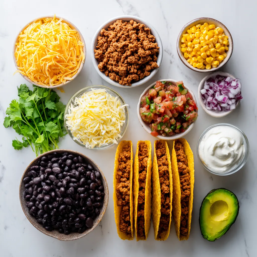 Die Hauptzutaten sind einfach und lecker. Taco-Schalen geben den Tacos Halt. Du kannst gemahlenes Truthahn oder Rindfleisch verwenden. Beide sind gut. Die Gewürze geben den Tacos Geschmack. Taco-Gewürz ist schnell und einfach. Füge Bohnen und Mais hinzu für mehr Textur und Nährstoffe. Zwiebeln bringen Süße und Aroma. Der Käse schmilzt schön und macht alles cremig.
