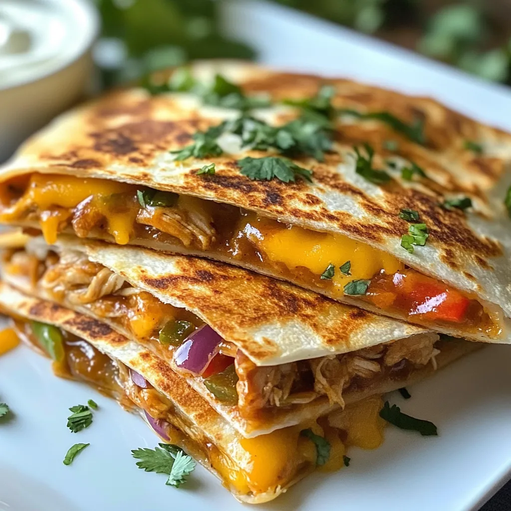 - 2 Tassen gekochtes Hühnerfleisch, zerrissen - 1 Tasse BBQ-Sauce - 1 Tasse geriebener Cheddar-Käse - 1 Tasse geriebener Mozzarella-Käse - 4 große Tortillas aus Weizenmehl - 1 kleine rote Zwiebel, dünn geschnitten - 1 Paprika (jede Farbe), dünn geschnitten - 2 Esslöffel Olivenöl - 1 Esslöffel frischer Koriander, gehackt (zum Garnieren) - Sauerrahm (zum Servieren) - Jalapeño-Scheiben (optional, für zusätzliche Schärfe) Ich wähle gerne frische Zutaten. Das macht den Geschmack einfach besser. Gekochtes Hühnerfleisch ist die Basis. Es muss zerrissen werden, damit es sich gut mit der BBQ-Sauce vermengen kann. Ich benutze eine Mischung aus Cheddar und Mozzarella. Diese Käsesorten schmelzen gut und geben einen tollen Geschmack. Die Tortillas sind wichtig. Ich bevorzuge große Weizentortillas, da sie stabil sind. Zwiebeln und Paprika bringen Frische und Farbe. Sie machen das Gericht interessanter. Olivenöl sorgt für einen schönen Bratgeschmack. Frischer Koriander verleiht den Quesadillas einen besonderen Kick. Sauerrahm ist ein toller Dip. Die Jalapeños können für etwas Schärfe sorgen. So bekommt jeder einen Biss, der ihm schmeckt. {{ingredient_image_2}} - Mische das zerrissene Hühnerfleisch mit der BBQ-Sauce in einer großen Schüssel. - Stelle sicher, dass das Hühnerfleisch gut mit der Sauce bedeckt ist. - Beiseite stellen, damit die Aromen sich verbinden können. - Erhitze das Olivenöl in einer Pfanne bei mittlerer Hitze. - Füge die dünn geschnittene Zwiebel und Paprika hinzu. - Brate das Gemüse für etwa 3-4 Minuten, bis es weich ist. - Nimm das Gemüse aus der Pfanne und lasse es abkühlen. - Lege eine Tortilla in die Pfanne. - Belege die Hälfte der Tortilla mit der BBQ-Hühnermischung. - Füge die angebratenen Zwiebeln und Paprika hinzu. - Streue die Hälfte des Cheddar- und Mozzarella-Käses darüber. - Klappe die Tortilla in der Mitte zusammen und brate sie 2-3 Minuten. - Überwache die Temperatur, bis die Unterseite goldbraun ist. - Drehe die Quesadilla vorsichtig um und brate die andere Seite 2-3 Minuten. - Nimm die Quesadilla aus der Pfanne und lasse sie eine Minute ruhen. - Schneide die Quesadilla in Wedges und wiederhole den Vorgang mit den restlichen Zutaten. - Goldbraun und knusprig halten: Achte darauf, die Tortilla bei mittlerer Hitze zu braten. So wird sie goldbraun und knusprig. Zu hohe Hitze kann sie verbrennen, bevor der Käse schmilzt. Drehe die Quesadilla sorgfältig um, um beide Seiten gleichmäßig zu braten. - Käse gleichmäßig schmelzen lassen: Verwende eine Mischung aus Cheddar und Mozzarella. Diese Kombination schmilzt gut und sorgt für den perfekten Käsegeschmack. Streue den Käse gleichmäßig über die Füllung, damit er überall schmilzt. - Zu viel Füllung vermeiden: Fülle die Tortilla nicht zu voll. Zu viel Füllung macht das Wenden schwer. Halte es einfach und lecker. Eine gute Menge ist etwa eine halbe Tasse Füllung pro Tortilla. - Ankleben verhindern: Verwende ausreichend Olivenöl in der Pfanne. Das hilft, ein Ankleben zu verhindern. Eine beschichtete Pfanne ist ebenfalls hilfreich, um die Quesadillas leicht zu wenden. - Beilagen und Dips: Serviere die Quesadillas mit Sauerrahm oder Guacamole. Das gibt einen frischen Geschmack. Du kannst auch Jalapeño-Scheiben für den extra Kick anbieten. - Anrichten für Partys: Schneide die Quesadillas in Wedges. Platziere sie auf einem großen Teller. Garniere sie mit frischem Koriander. Das sieht toll aus und macht sie einladend. Pro Tipps Hühnchen vorbereiten: Für zusätzlichen Geschmack das Hühnerfleisch über Nacht in der BBQ-Sauce marinieren. Käse-Mischung: Experimentieren Sie mit verschiedenen Käsesorten wie Pepper Jack oder Gouda für eine interessante Geschmacksvariation. Knusprigere Quesadillas: Fügen Sie etwas mehr Olivenöl in die Pfanne hinzu, um die Quesadillas besonders knusprig zu machen. Veggie-Option: Ersetzen Sie das Hühnchen durch schwarze Bohnen oder Tofu für eine vegetarische Variante. {{image_4}} Wenn du kein Hühnerfleisch magst, probiere Rindfleisch. Zerkleinertes Rindfleisch passt gut zu BBQ-Sauce. Es bringt einen kräftigen Geschmack. Du kannst auch Vegetarische Alternativen verwenden. Gegrillte Pilze oder schwarze Bohnen sind tolle Optionen. Sie machen die Quesadilla herzhaft und lecker. Spiele mit Gewürzen und Kräutern. Füge Kreuzkümmel oder Paprika hinzu. Diese geben dem Gericht einen besonderen Kick. Du kannst auch verschiedene Käsesorten verwenden. Probiere Gouda oder Pepper Jack. Diese Käse schmelzen gut und bringen neue Aromen. Die Wahl der BBQ-Sauce ist wichtig. Süße Saucen geben einen milden Geschmack. Würzige Saucen bringen mehr Pfiff. Du kannst auch deine eigene BBQ-Sauce machen. Mische Tomatensauce, Honig und etwas Essig. So erhältst du einen einzigartigen Geschmack. Wenn Sie BBQ Chicken Quesadillas übrig haben, können Sie sie leicht aufbewahren. Warten Sie, bis sie abgekühlt sind. Wickeln Sie die Quesadillas fest in Frischhaltefolie ein oder legen Sie sie in einen luftdichten Behälter. Sie können sie im Kühlschrank für bis zu drei Tage aufbewahren. Wenn Sie sie länger aufbewahren möchten, frieren Sie sie ein. So bleiben sie bis zu drei Monate frisch. Um die Quesadillas wieder zu wärmen, gibt es zwei einfache Methoden. Die erste ist die Mikrowelle. Legen Sie eine Quesadilla auf einen Teller und decken Sie sie mit einem feuchten Papiertuch ab. Erwärmen Sie sie für 1 bis 2 Minuten, bis sie heiß sind. Die zweite Methode ist die Pfanne. Erhitzen Sie eine Pfanne bei mittlerer Hitze und legen Sie die Quesadilla hinein. Braten Sie sie 2 bis 3 Minuten auf jeder Seite, bis sie knusprig ist. So bleibt der Käse schön schmelzig und die Quesadilla wird wieder knusprig. Die Zubereitung von BBQ Chicken Quesadillas dauert insgesamt etwa 25 Minuten. Die Vorbereitungszeit beträgt nur 10 Minuten. In dieser Zeit zerrisst du das Hühnerfleisch und bereitest das Gemüse vor. Danach kochst du die Quesadillas in der Pfanne für jeweils 