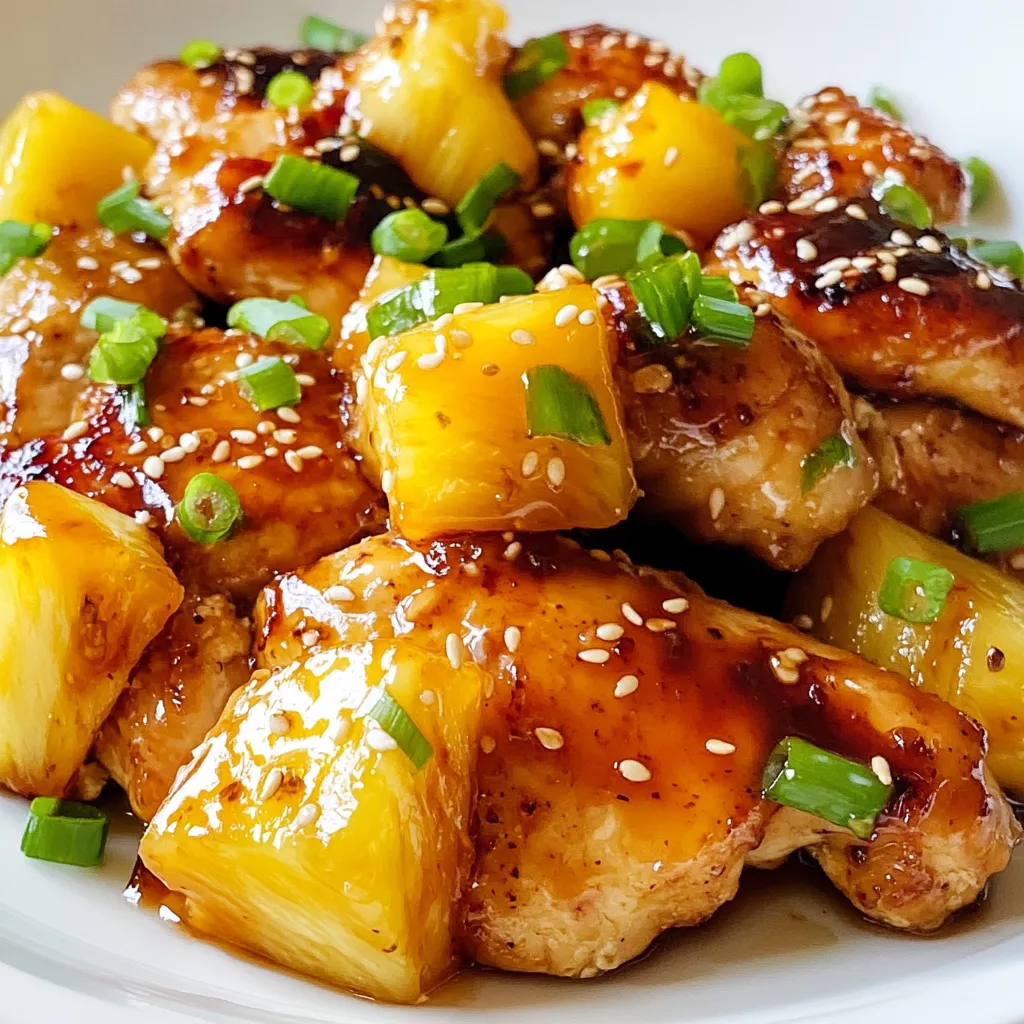 Während das Hähnchen kocht, erhitze die übrig gebliebene Marinade in einem kleinen Topf. Lass sie 3-5 Minuten köcheln, bis sie eindickt. In den letzten Minuten des Garens gib die Ananasstücke dazu. Brate sie 2-3 Minuten, bis sie karamelisiert sind. Nimm das Hähnchen und die Ananas vom Herd. Beträufle das Hähnchen mit der eingedickten Marinade und lege die Ananas darauf. Garniere das Gericht mit Frühlingszwiebeln und Sesamsamen.