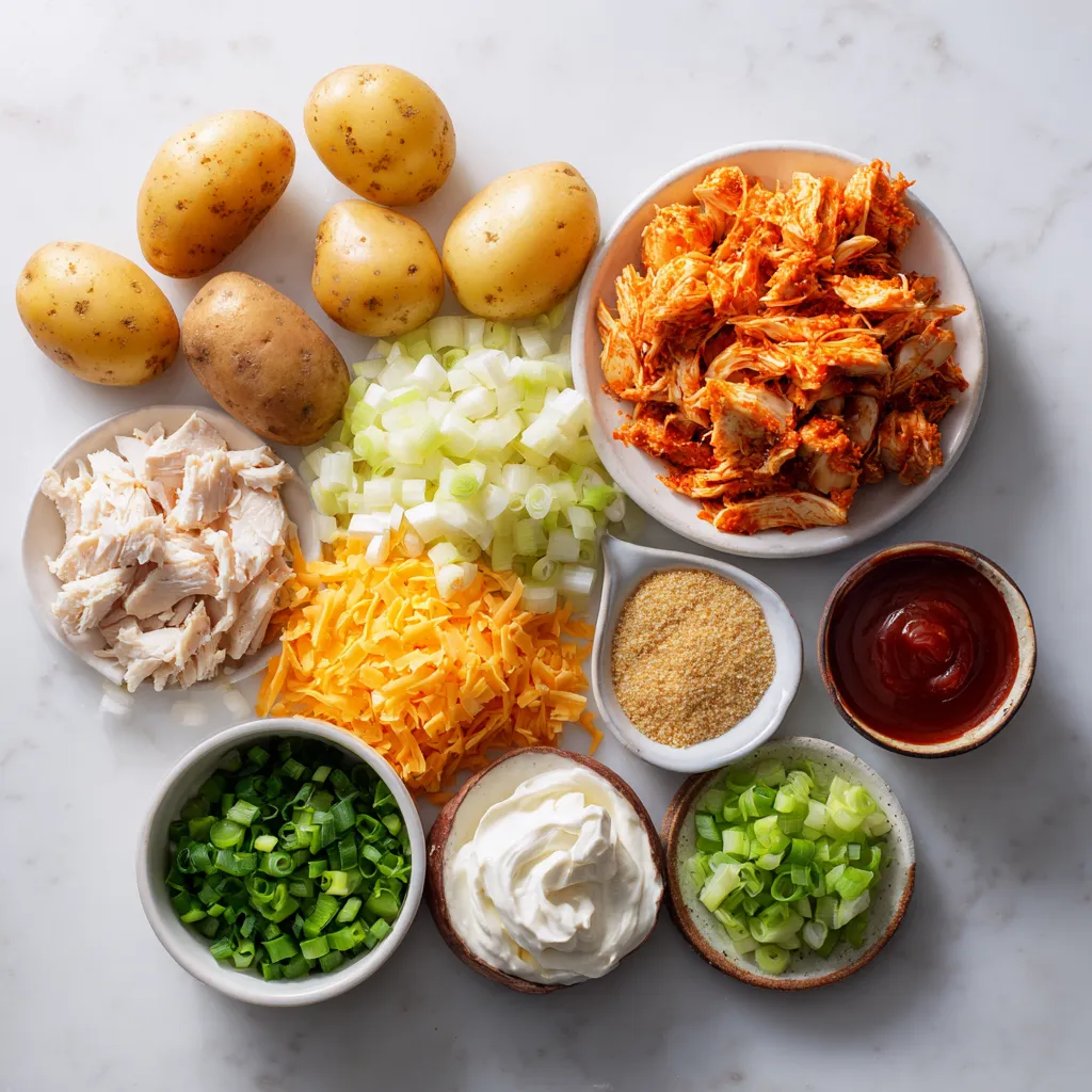 Die Hauptzutaten sind einfach und lecker. Russet-Kartoffeln geben dem Gericht eine tolle Basis. Sie sind stärkehaltig und machen das Essen schön cremig. Zerrupftes Hühnerfleisch bringt viel Geschmack. Verwenden Sie Hähnchen von einem Rotisserie-Huhn. Es ist saftig und zart. Die Buffalo-Sauce sorgt für die richtige Schärfe. So wird der Auflauf richtig würzig.