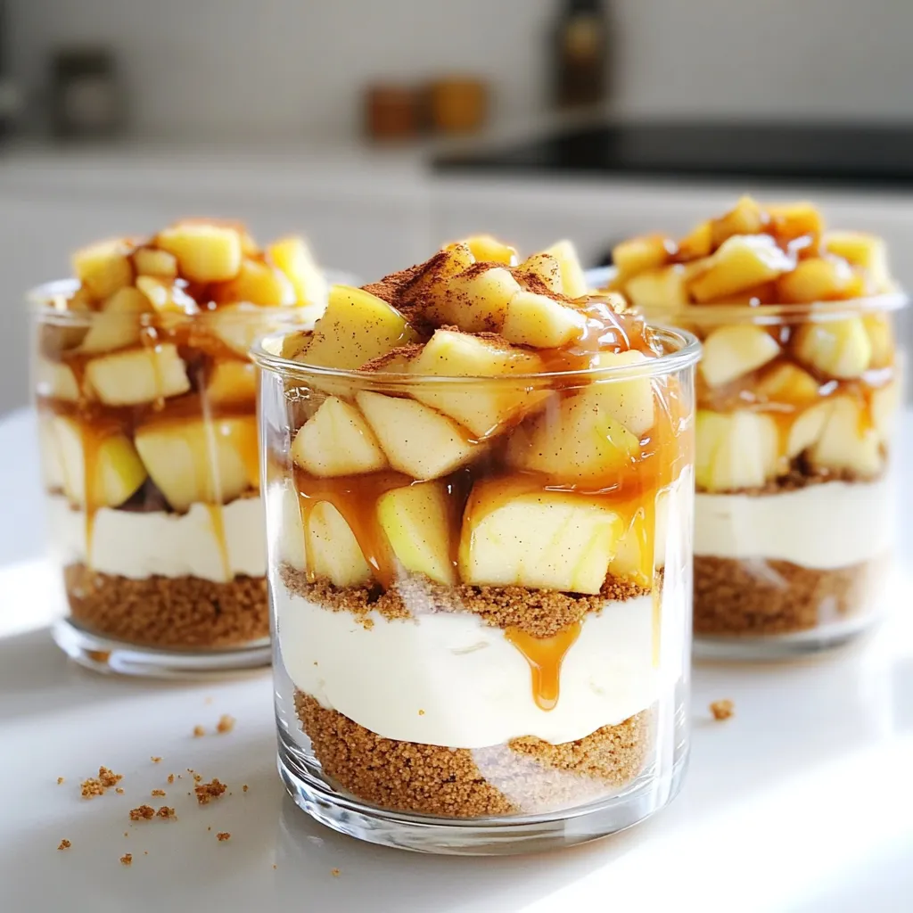 Jetzt schichten wir die Parfaits. Nehmen Sie Serviergläser oder Parfait-Gläser. Fügen Sie zuerst eine Schicht zerbröselte Graham-Kekse hinzu. Diese geben eine knusprige Textur. Darauf kommt eine Schicht der Frischkäsecreme. Dann folgt eine Schicht der karamellisierten Äpfel. Wiederholen Sie diesen Vorgang, bis die Gläser voll sind. Achten Sie darauf, mit einer Schicht Frischkäsecreme abzuschließen. Zuletzt träufeln Sie Karamellsauce über die oberste Schicht. Garnieren Sie die Parfaits mit etwas Graham-Keksbröseln. Stellen Sie die Parfaits für mindestens 30 Minuten in den Kühlschrank. So werden die Schichten fest und lecker.