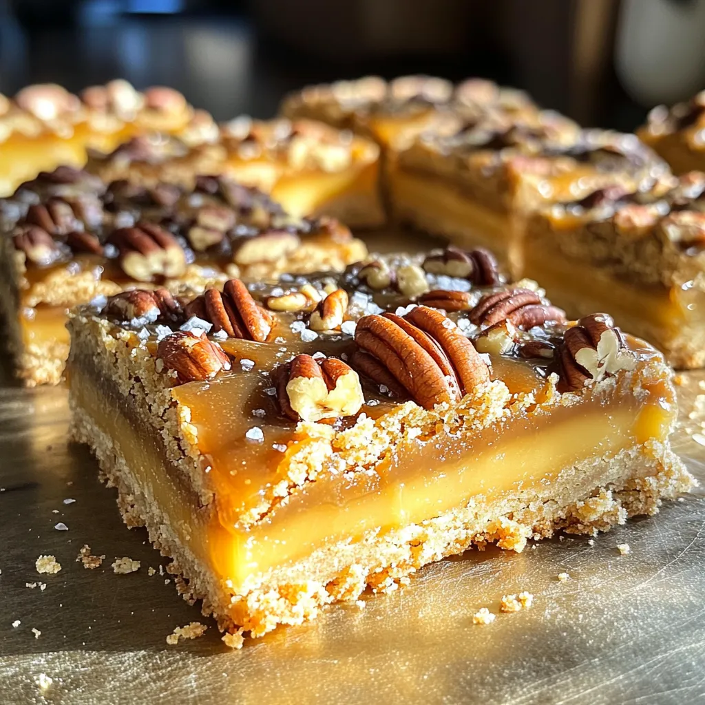 Verteile die Karamellsauce gleichmäßig über die gebackene Shortbread-Basis. Streue die restlichen Pekannüsse darüber und füge eine Prise Meersalz hinzu. Stelle die Form für 10-15 Minuten zurück in den Ofen. Achte darauf, dass das Karamell blubbert. Lass die Riegel vollständig abkühlen, bevor du sie in Stücke schneidest. So bleiben sie stabil und leicht zu servieren.