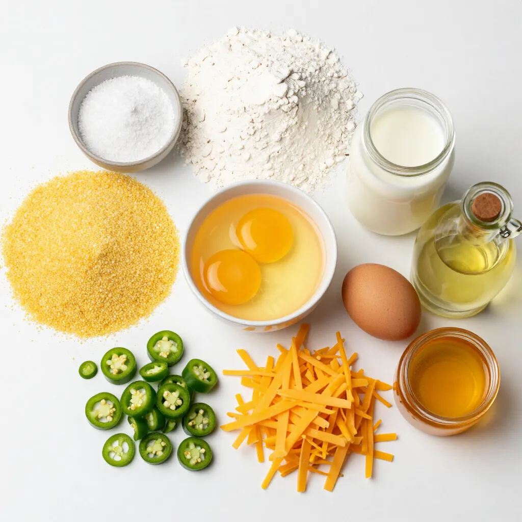Hier sind die Zutaten für dein Käse-Jalapeño-Maisbrot. Jedes Element bringt seinen eigenen Geschmack mit.