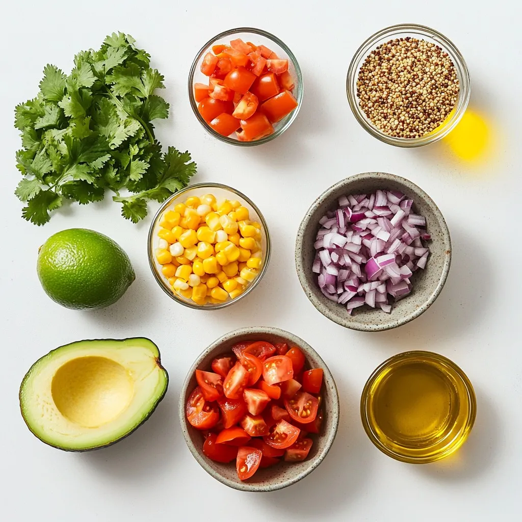 Die Hauptzutaten sind wichtig für den Salat. Quinoa ist die Basis. Sie gibt dem Salat einen nussigen Geschmack. Tomaten bringen Frische. Paprika fügt Farbe und Crunch hinzu. Mais ist süß und knackig. Avocado macht den Salat cremig. Zwiebel gibt einen tollen Biss. Koriander bringt ein frisches Aroma. Diese Zutaten sorgen für einen leckeren, bunten Salat.
