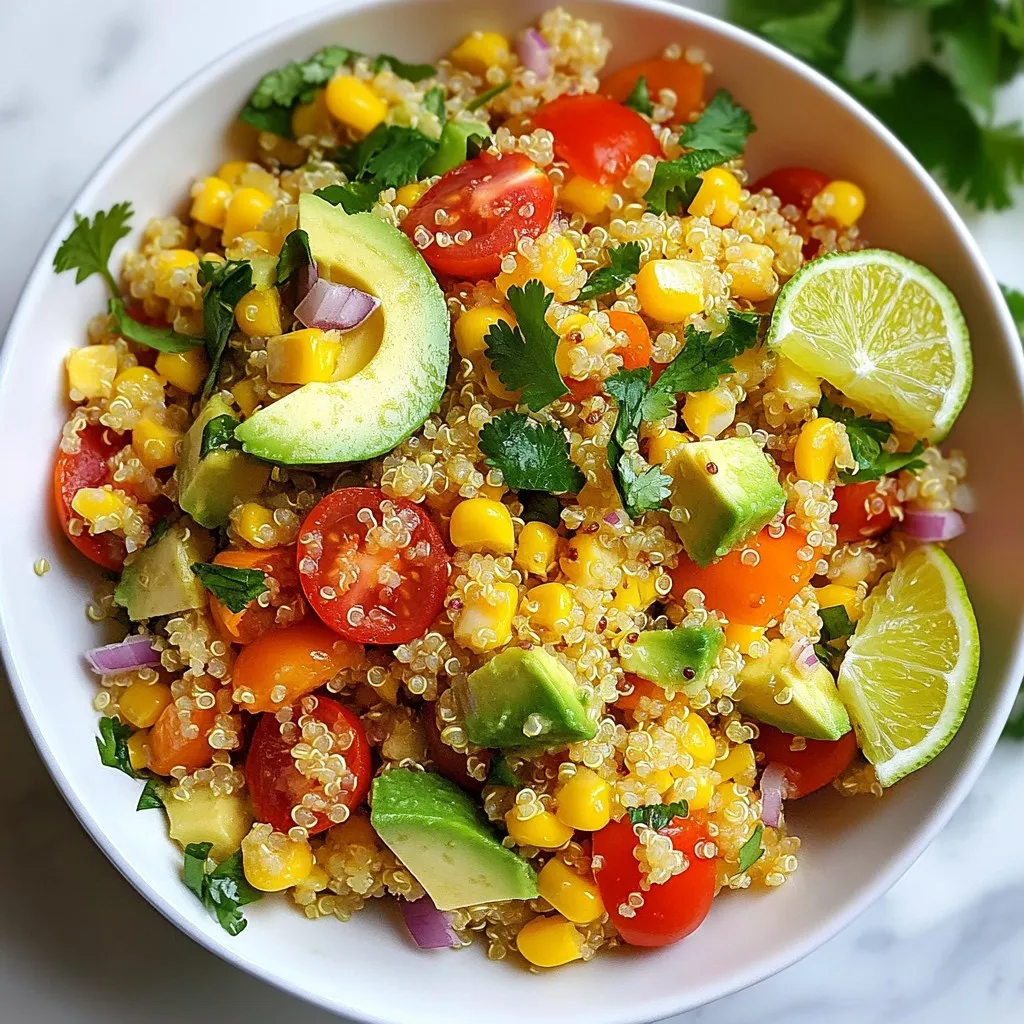 - 1 Tasse Quinoa, gründlich gewaschen - 2 Tassen Gemüsebrühe oder Wasser - 1 Tasse Kirschtomaten, halbiert - 1 Paprika, gewürfelt (beliebige Farbe) - 1 Tasse Mais (frisch, aus der Dose oder tiefgefroren) - 1 Avocado, gewürfelt - ½ Tasse rote Zwiebel, fein gehackt - ½ Tasse frischer Koriander, gehackt Die Hauptzutaten sind wichtig für den Salat. Quinoa ist die Basis. Sie gibt dem Salat einen nussigen Geschmack. Tomaten bringen Frische. Paprika fügt Farbe und Crunch hinzu. Mais ist süß und knackig. Avocado macht den Salat cremig. Zwiebel gibt einen tollen Biss. Koriander bringt ein frisches Aroma. Diese Zutaten sorgen für einen leckeren, bunten Salat. - Saft von 2 Limetten - 3 Esslöffel Olivenöl - 1 Teelöffel gemahlener Kreuzkümmel - Salz und Pfeffer nach Geschmack Die Gewürze sind der Schlüssel zur Note. Limettensaft gibt Frische und Säure. Olivenöl sorgt für eine schöne Textur. Kreuzkümmel fügt Tiefe hinzu. Salz und Pfeffer sind nötig, um alles abzurunden. Die Kombination dieser Gewürze macht jeden Bissen einzigartig. Das Dressing bringt alle Zutaten zusammen und hebt den Geschmack hervor. Der Cilantro Lime Quinoa Salad ist nährstoffreich. Quinoa ist eine großartige Proteinquelle. Sie enthält alle neun essentiellen Aminosäuren. Gemüse wie Tomaten und Paprika ist reich an Vitaminen. Diese Zutaten fördern die Gesundheit. Avocado liefert gesunde Fette. Koriander hat viele Antioxidantien. Der Salat ist nicht nur lecker, sondern auch gesund. Er ist eine tolle Wahl für eine ausgewogene Ernährung. {{ingredient_image_2}} Um die Quinoa perfekt zuzubereiten, beginne mit einem mittelgroßen Topf. Fülle ihn mit 1 Tasse gewaschener Quinoa und 2 Tassen Gemüsebrühe oder Wasser. Erhitze das Wasser und bringe es zum Kochen. Reduziere dann die Hitze und decke den Topf ab. Lass die Quinoa etwa 15 Minuten köcheln. Wenn die Quinoa gar ist, sollte sie das Wasser vollständig aufgenommen haben. Nimm den Topf vom Herd und lass die Quinoa abkühlen. In einer großen Schüssel mische die frischen Zutaten. Füge 1 Tasse halbierte Kirschtomaten, 1 gewürfelte Paprika, 1 Tasse Mais, 1 gewürfelte Avocado, ½ Tasse fein gehackte rote Zwiebel und ½ Tasse gehackten Koriander hinzu. Rühre alles gut um, damit sich die Aromen verbinden. Für das Dressing nimm eine kleine Schüssel. Press den Saft von 2 Limetten hinein. Füge 3 Esslöffel Olivenöl, 1 Teelöffel gemahlenen Kreuzkümmel, sowie Salz und Pfeffer nach Geschmack hinzu. Verquirle die Mischung gut, bis alles eine homogene Konsistenz hat. Wenn die Quinoa abgekühlt ist, gib sie zur Gemüsemischung in die große Schüssel. Gieße das Limetten-Dressing gleichmäßig darüber. Rühre vorsichtig, bis alle Zutaten gut vermischt sind. Schmecke den Salat ab und füge bei Bedarf mehr Salz, Limettensaft oder Olivenöl hinzu. Lass den Salat 15 Minuten bei Raumtemperatur ruhen, damit die Aromen gut durchziehen. Um Quinoa perfekt zu kochen, wasche sie zuerst gut. Das entfernt Bitterstoffe und macht den Geschmack besser. Verwende zwei Tassen Gemüsebrühe oder Wasser für jede Tasse Quinoa. Bring die Mischung zum Kochen, dann reduziere die Hitze. Decke den Topf zu und lass die Quinoa etwa 15 Minuten köcheln. Wenn sie fertig ist, lass sie abkühlen, damit der Salat frisch bleibt. Du kannst viele Dinge hinzufügen, um den Geschmack zu ändern. Probiere schwarze Bohnen für mehr Protein oder gehackte Jalapeños für etwas Schärfe. Geröstete Nüsse oder Samen geben einen tollen Crunch. Frische Kräuter wie Petersilie oder Minze passen auch gut. Sei kreativ und finde deine Lieblingskombinationen. Für die Präsentation kannst du eine große Schüssel nutzen oder individuelle Teller anrichten. Garnieren mit frischem Koriander sieht schön aus. Füge Limettenviertel hinzu, die die Gäste selbst verwenden können. So machst du den Salat noch einladender. Ein schöner, bunter Salat beeindruckt jeden. Pro Tipps Quinoa richtig kochen: Achten Sie darauf, die Quinoa gründlich zu waschen, um Bitterstoffe zu entfernen. Dies verbessert den Geschmack und die Textur des Salats. Frische Zutaten verwenden: Verwenden Sie frisches Gemüse, wenn möglich, um den Salat noch geschmackvoller und nährstoffreicher zu machen. Variationen des Dressings: Experimentieren Sie mit verschiedenen Kräutern oder Gewürzen im Dressing, um dem Salat eine persönliche Note zu verleihen. Vorbereitung im Voraus: Bereiten Sie den Salat einige Stunden im Voraus zu, damit die Aromen gut durchziehen können, bevor Sie ihn servieren. {{image_4}} Um den Cilantro Lime Quinoa Salad noch bunter zu machen, füge einige neue Zutaten hinzu. Du kannst schwarze Bohnen oder rote Bohnen für mehr Protein verwenden. Auch frische Gurken geben einen tollen Crunch. Wenn du etwas Süßes magst, probiere Würfel von Mango oder Ananas. Diese Früchte bringen eine fruchtige Note in den Salat. Vergiss nicht, die Zutaten gut zu mischen, damit jeder Bissen lecker ist. Dieser Salat ist von Natur aus vegan und glutenfrei. Du musst einfach darauf achten, dass die Gemüsebrühe glutenfrei ist. Wenn du eine Low-Carb-Option suchst, kannst du die Quinoa durch Blumenkohlreis ersetzen. Das gibt dir die gleiche Textur, jedoch weniger Kohlenhydrate. Die Limetten und der Koriander bleiben gleich und verleihen dem Gericht weiterhin viel Geschmack. Im Sommer sind frische Erbsen und Zucchini eine tolle Ergänzung. Im Herbst kannst du geröstete Kürbiswürfel hinzufügen. Diese saisonalen Zutaten machen den Salat noch interessanter. Achte darauf, die frischen Zutaten zu wählen, die gerade Saison haben. So schmeckt der Salat nicht nur besser, sondern ist auch gesünder und nachhaltiger. Um den Cilantro Lime Quinoa Salad frisch zu halten, bewahren Sie ihn in einem luftdichten Behälter auf. Stellen Sie sicher, dass der Salat vollständig abgekühlt ist, bevor Sie ihn in den Kühlschrank stellen. Dies verhindert Kondensation und hält die Zutaten knusprig. Der Salat bleibt im Kühlschrank etwa drei bis fünf Tage hal