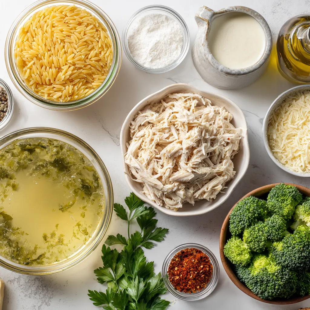 Die Hauptzutaten bilden die Basis für unser Gericht. Die Orzo-Nudeln sind klein und leicht. Sie nehmen die Aromen gut auf. Die Hühnerbrühe bringt Geschmack und macht das Gericht saftig. Das zerrissene Hähnchen sorgt für eine gute Proteinquelle.