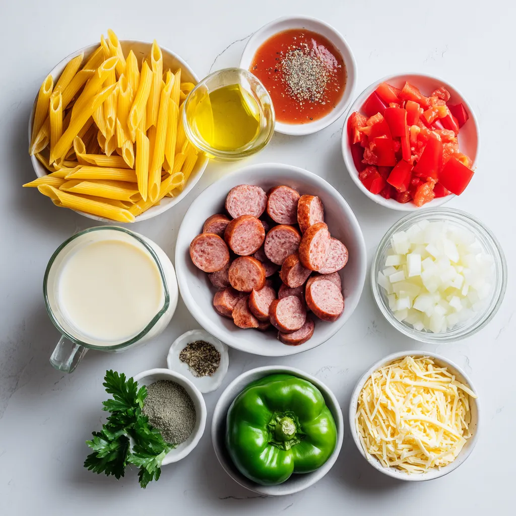 Hauptzutaten für cremige Cajun Wurst-Pasta