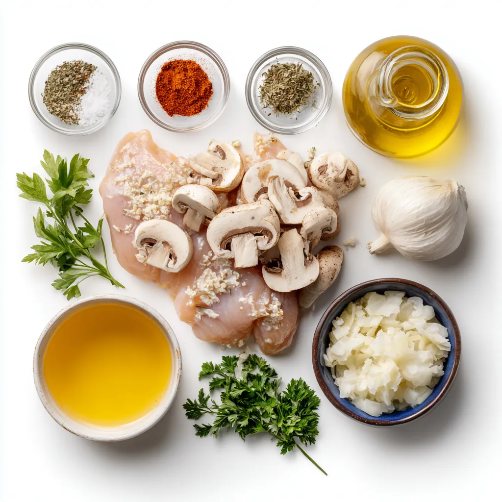 Hauptzutaten für die cremige Pilz-Hähnchen-Pfanne