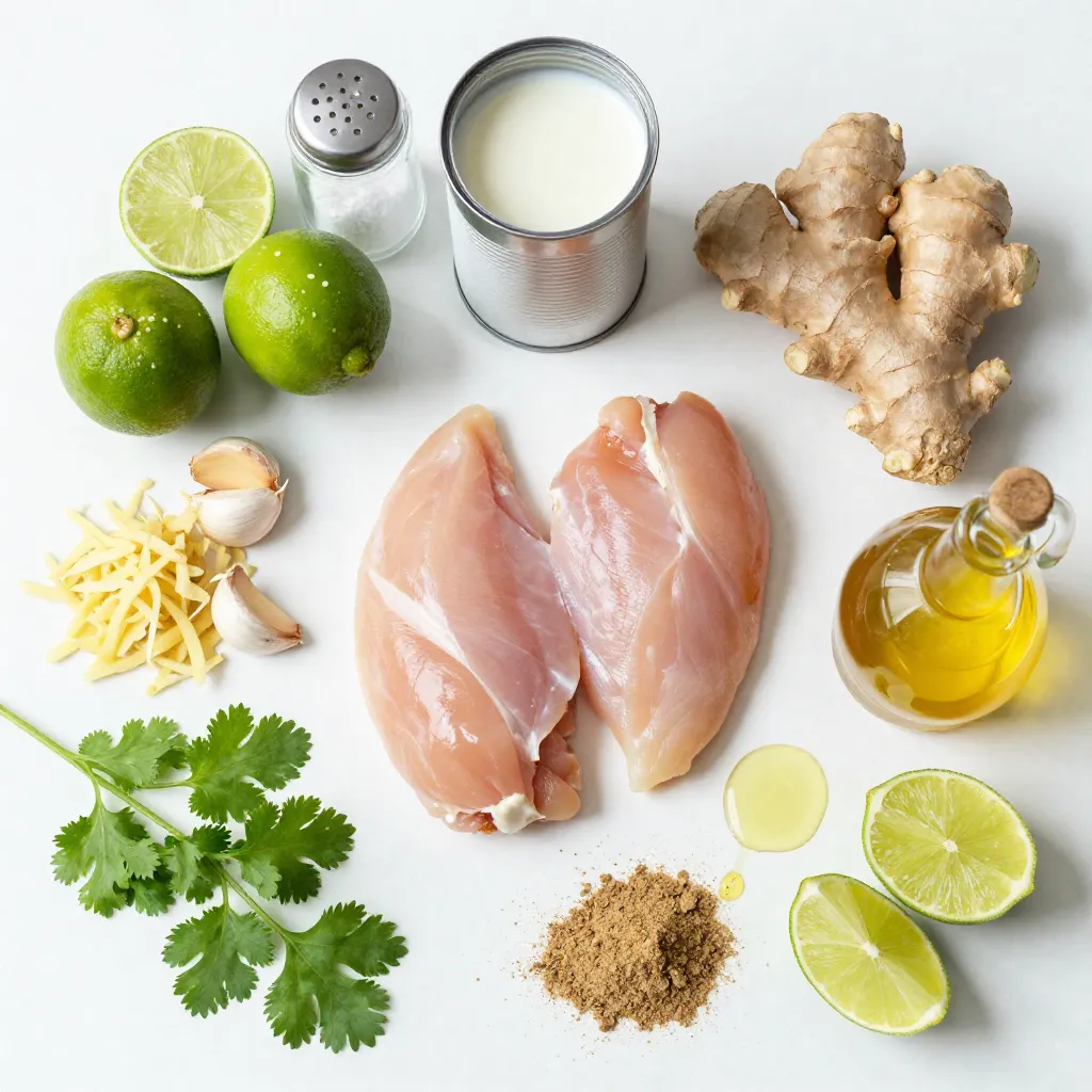 Die Hauptzutaten sind einfach zu finden. Hähnchenbrustfilets sind mager und zart. Kokosmilch bringt die cremige Textur. Limettensaft und -schale fügen frische Aromen hinzu.