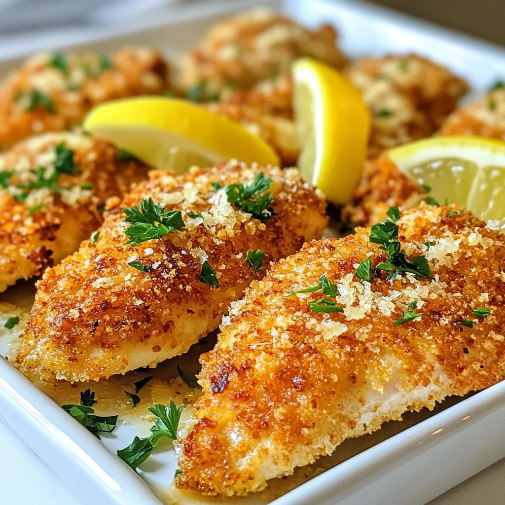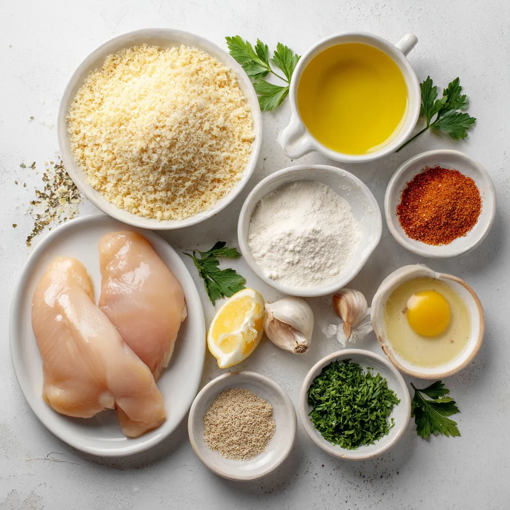 - 4 Hähnchenbrustfilets, ohne Haut und Knochen - 240 ml Buttermilch - 100 g Panko Semmelbrösel - 100 g geriebener Parmesan Die Hauptzutaten für das Rezept sind einfach zu finden. Hähnchenbrustfilets sind zart und saftig. Buttermilch macht das Fleisch noch besser. Panko Semmelbrösel sorgen für extra Knusprigkeit. Parmesan gibt viel Geschmack. - 1 Teelöffel Knoblauchpulver - 1 Teelöffel Zwiebelpulver - 1/2 Teelöffel geräuchertes Paprikapulver - 60 ml Olivenöl - 1 Esslöffel Zitronensaft Die Gewürze sind wichtig für den Geschmack. Knoblauchpulver bringt eine schöne Note. Zwiebelpulver ergänzt das Aroma. Geräuchertes Paprikapulver gibt eine leichte Schärfe. Olivenöl sorgt für das Braten, und Zitronensaft bringt Frische. - Frische Petersilie, gehackt - Salz und Pfeffer nach Geschmack Die Garnierung macht das Gericht lebendig. Frische Petersilie gibt Farbe und Geschmack. Salz und Pfeffer helfen, die Aromen zu betonen. Du kannst die Menge nach deinem Geschmack anpassen. {{ingredient_image_2}} Marinieren Sie die Hähnchenbrustfilets mindestens 30 Minuten in Buttermilch. Diese Zeit macht das Fleisch zart. Die Buttermilch hilft, die Feuchtigkeit zu halten. Sie sorgt auch für einen tollen Geschmack. Dies ist ein wichtiger Schritt, den Sie nicht auslassen sollten. Heizen Sie den Ofen auf 200°C vor. Legen Sie ein Backblech mit Backpapier aus. So bleibt das Hähnchen knusprig und wird nicht anbrennen. Bereiten Sie die Paniermasse vor, während der Ofen heizt. Dies spart Zeit und macht den Prozess einfacher. Wenden Sie das Hähnchen zuerst in Mehl. Klopfen Sie das überschüssige Mehl ab. Tauchen Sie das Hähnchen dann in die Paniermehlmischung. Drücken Sie fest, damit die Panade gut haftet. Erhitzen Sie Olivenöl in einer großen Pfanne. Braten Sie die panierten Hähnchenbrustfilets 3-4 Minuten pro Seite. Sie sollen goldbraun werden. Stellen Sie die Pfanne nach dem Braten in den Ofen. Backen Sie das Hähnchen 15-20 Minuten lang. Überprüfen Sie die Innentemperatur. Sie sollte 75°C betragen. In der Zwischenzeit bereiten Sie die Knoblauchsauce vor. Erhitzen Sie etwas Olivenöl in einem kleinen Topf. Fügen Sie den gehackten Knoblauch hinzu und braten Sie ihn 1-2 Minuten. Rühren Sie dann Zitronensaft unter. Dies wird die Sauce frisch und lecker machen. Verwenden Sie Panko für extra Knusprigkeit. Panko sind grobe Semmelbrösel aus Japan. Sie machen das Hähnchen besonders knusprig. Wenn Sie Panko verwenden, bleibt das Hähnchen außen schön knusprig und innen saftig. Mischen Sie Panko mit Parmesan für den besten Geschmack. Eine längere Marinierzeit kann das Hähnchen zarter machen. Wenn Sie das Hähnchen 2 bis 4 Stunden in der Buttermilch lassen, zieht der Geschmack besser ein. Allerdings kann das Hähnchen auch zu weich werden, wenn es zu lange mariniert. 30 Minuten sind das Minimum, aber 2 Stunden sind ideal. Die Innentemperatur ist wichtig für die Sicherheit. Verwenden Sie ein Fleischthermometer, um 75°C zu erreichen. Stechen Sie in die dickste Stelle des Hähnchens. Eine genaue Temperatur sorgt dafür, dass das Hähnchen durchgegart ist, aber nicht trocken wird. Wenn Sie kein Thermometer haben, schneiden Sie das Hähnchen an; der Saft sollte klar sein, nicht rosa. Pro Tipps Hähnchen marinieren: Lassen Sie das Hähnchen mindestens 30 Minuten in der Buttermilch marinieren, um es zart und saftig zu machen. Panko verwenden: Verwenden Sie Panko-Semmelbrösel für eine extra knusprige Panade, die das Hähnchen noch schmackhafter macht. Ofen vorheizen: Stellen Sie sicher, dass der Ofen vor dem Backen auf die richtige Temperatur vorgeheizt ist, um ein gleichmäßiges Garen zu gewährleisten. Knoblauchsauce anpassen: Passen Sie die Knoblauchsauce nach Ihrem Geschmack an, indem Sie mehr oder weniger Knoblauch hinzufügen, je nach Vorliebe für den Geschmack. {{image_4}} Für mehr Geschmack kann man andere Kräuter und Gewürze verwenden. Zum Beispiel, Rosmarin und Thymian passen gut. Auch Oregano gibt einen tollen Geschmack. Eine Mischung aus italienischen Kräutern macht das Hähnchen besonders aromatisch. Experimentiere mit Curry oder Chili für einen scharfen Kick. Das Crispy Parmesan Chicken lässt sich gut mit saisonalem Gemüse servieren. Gegrillte Zucchini, Paprika oder Spargel ergänzen das Gericht perfekt. Du kannst auch einen frischen Salat dazugeben. Das bringt Farbe auf den Teller und macht das Essen noch gesünder. Denke daran, das Gemüse leicht zu würzen, damit es die Aromen des Hähnchens ergänzt. Wenn du eine vegetarische Option möchtest, tausche das Hähnchen gegen Tofu oder Blumenkohl aus. Tofu nimmt die Marinade gut auf und wird schön knusprig. Blumenkohl kann in Röschen geteilt und ebenfalls paniert werden. Beide Optionen sind lecker und sättigend. So hat jeder etwas davon! Um übrig gebliebenes Hähnchen richtig zu lagern, lege es in einen luftdichten Behälter. Stelle sicher, dass das Hähnchen vollständig abgekühlt ist, bevor du es verpackst. So bleibt die Knusprigkeit besser erhalten. Du kannst das Hähnchen bis zu drei Tage im Kühlschrank aufbewahren. Falls du mehr Zeit brauchst, friere die Reste ein. Achte darauf, das Hähnchen gut einzuwickeln, um Gefrierbrand zu vermeiden. Um das Hähnchen wieder knusprig zu machen, verwende den Ofen. Heize den Ofen auf 180°C vor. Lege das Hähnchen auf ein Backblech und backe es 10-15 Minuten. So bleibt es saftig und wird wieder knusprig. Du kannst auch eine Pfanne benutzen. Wärme etwas Öl in der Pfanne und brate das Hähnchen für einige Minuten, bis es heiß ist. Vermeide die Mikrowelle, denn das macht das Hähnchen weich. Im Kühlschrank bleibt das Hähnchen bis zu drei Tage frisch. Achte darauf, es schnell zu verzehren, um die beste Qualität zu gewährleisten. Wenn du das Hähnchen einfrierst, kann es bis zu drei Monate haltbar sein. Beschrifte die Verpackung mit dem Datum, damit du weißt, wann du es eingefroren hast. So vermeidest du, dass es zu lange bleibt. - Empfohlene Marinierzeit: Ich empfehle