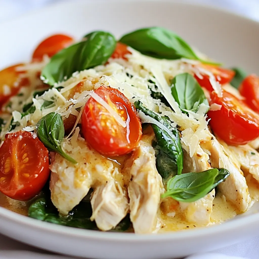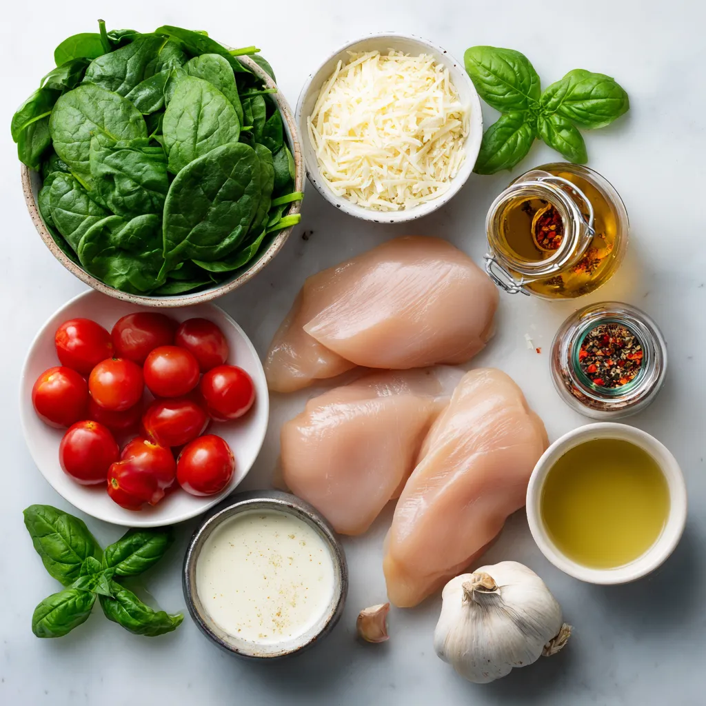 Die Hauptzutaten sind einfach zu finden. Die Hähnchenbrust bringt viel Protein. Kirschtomaten und Spinat fügen frische Aromen hinzu. Zwiebel und Knoblauch geben Geschmack und Tiefe. Schlagsahne und Hühnerbrühe machen die Sauce cremig.