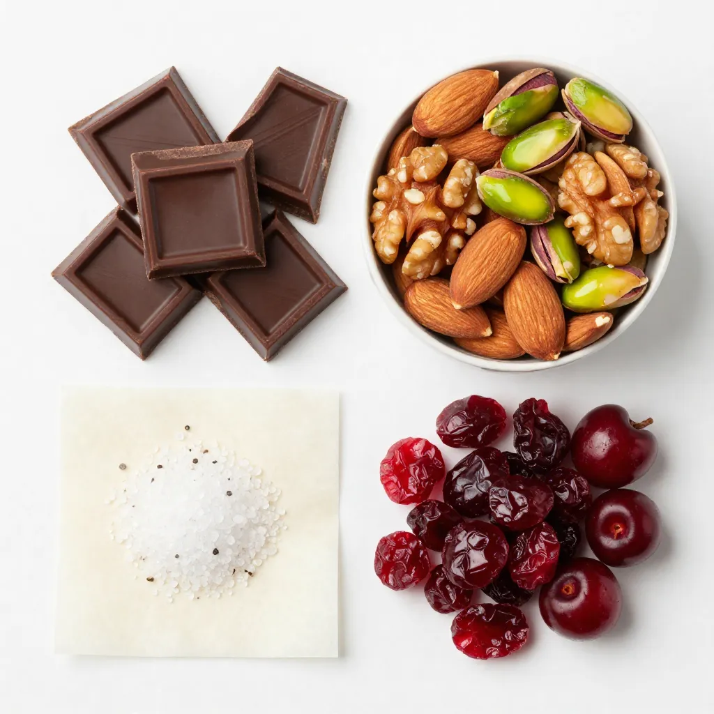 Die Hauptzutaten für diese köstliche Barke sind einfach zu finden. Ich wähle immer Zartbitterschokolade mit mindestens 70 % Kakao. Diese sorgt für einen intensiven Geschmack. Gemischte Nüsse bringen Crunch und gesunde Fette. Mandeln, Walnüsse und Pistazien machen die Barke besonders lecker. Getrocknete Cranberries oder Kirschen geben einen süßen, fruchtigen Kontrast. Das flaumige Meersalz ist das i-Tüpfelchen. Es hebt den Geschmack der Schokolade hervor und gibt einen feinen Salzkick.