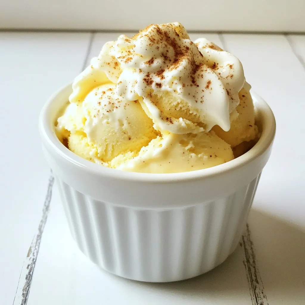 - Servieren Sie Kugeln des Eggnog-Eises, garniert mit Schlagsahne und einem Hauch von Muskatnuss.