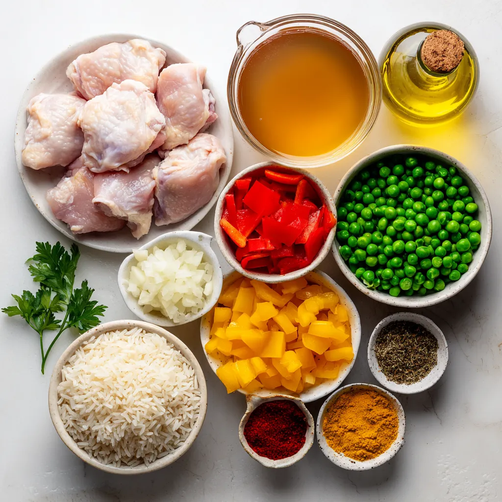 Um das einfache One-Pot Chicken and Rice Rezept zuzubereiten, brauchen wir einige frische und leckere Zutaten. Hier ist die Liste der Zutaten, die du benötigst:
