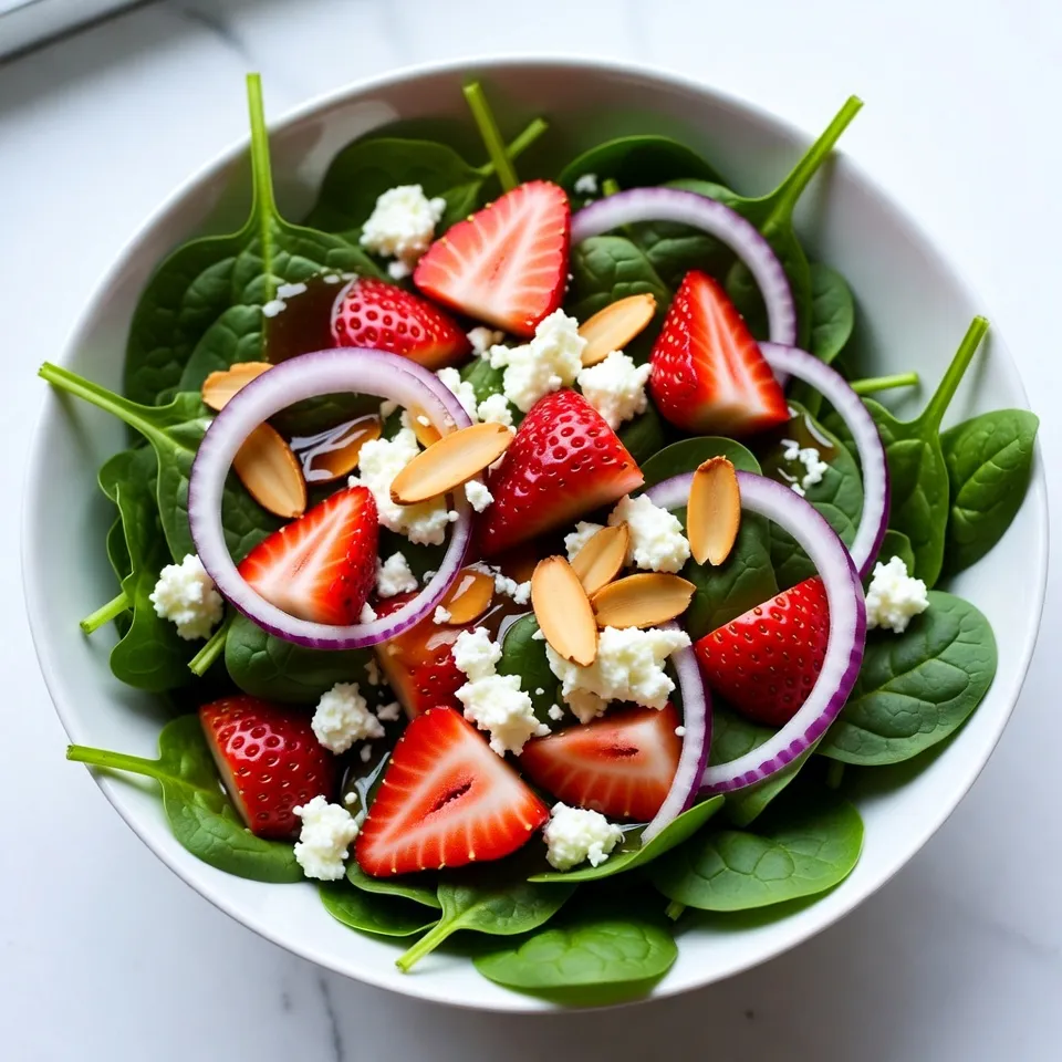 Du kannst die Zutaten im Voraus schneiden. Bewahre die Erdbeeren und den Spinat getrennt auf. Die Zwiebeln und Mandeln können ebenfalls früh vorbereitet werden. Mische alles erst kurz vor dem Servieren. So bleibt der Salat frisch und lecker.