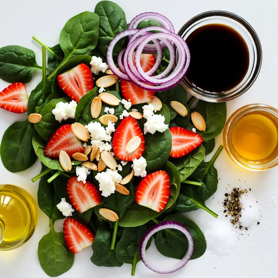 Diese Zutaten bilden die Basis für einen frischen und nahrhaften Salat. Der Spinat bringt eine zarte Textur, während die Erdbeeren süß und saftig sind. Feta-Käse fügt einen salzigen Geschmack hinzu, und die Mandeln sorgen für einen knusprigen Biss. Die roten Zwiebeln geben dem Salat einen leichten Schärfe-Kick.
