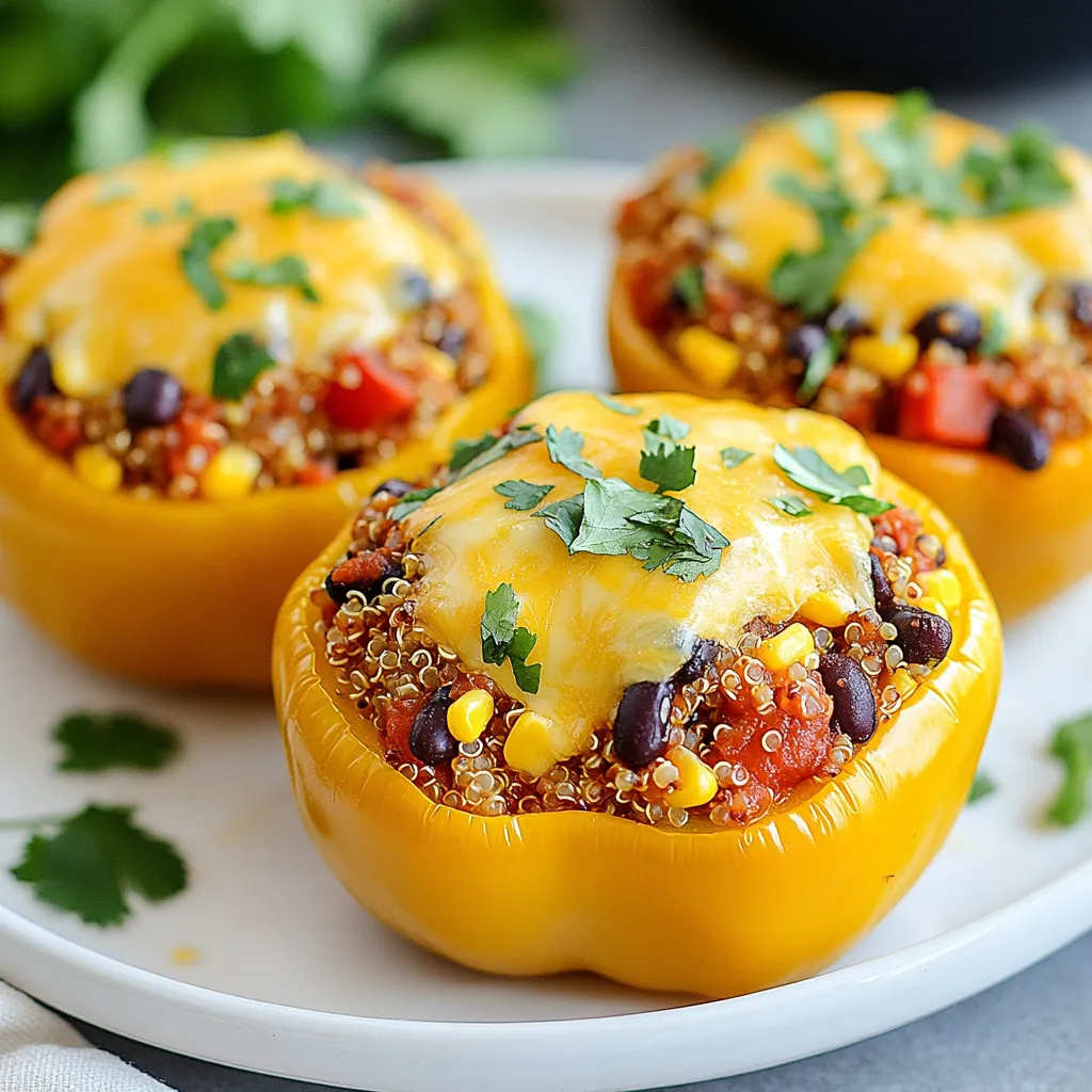 Ein köstliches und gesundes Gericht mit Quinoa, Bohnen und frischem Gemüse, gefüllt in bunten Paprika.