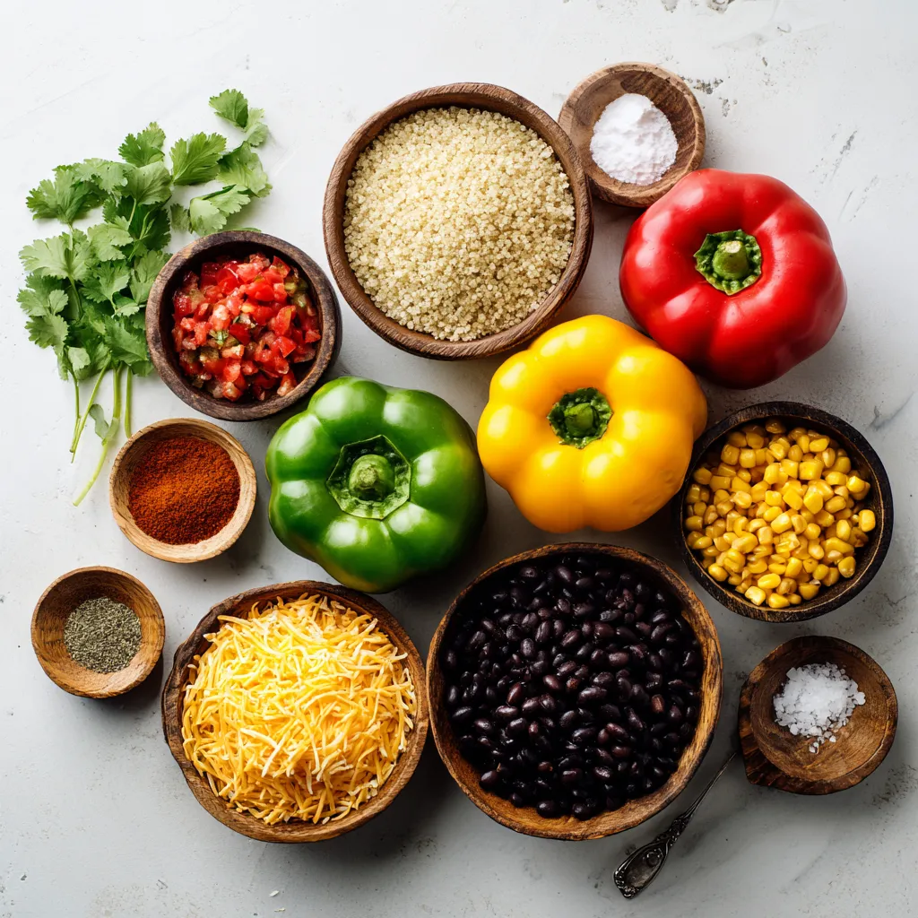 Diese Zutaten bilden die Basis für ein leckeres Gericht. Die Paprika gibt es in vielen Farben, was das Gericht bunt macht. Quinoa ist ein gesunder Ersatz für Reis und gibt dir zusätzliche Nährstoffe. Die Bohnen fügen Proteine hinzu, während der Mais und die Tomaten für einen frischen Geschmack sorgen.