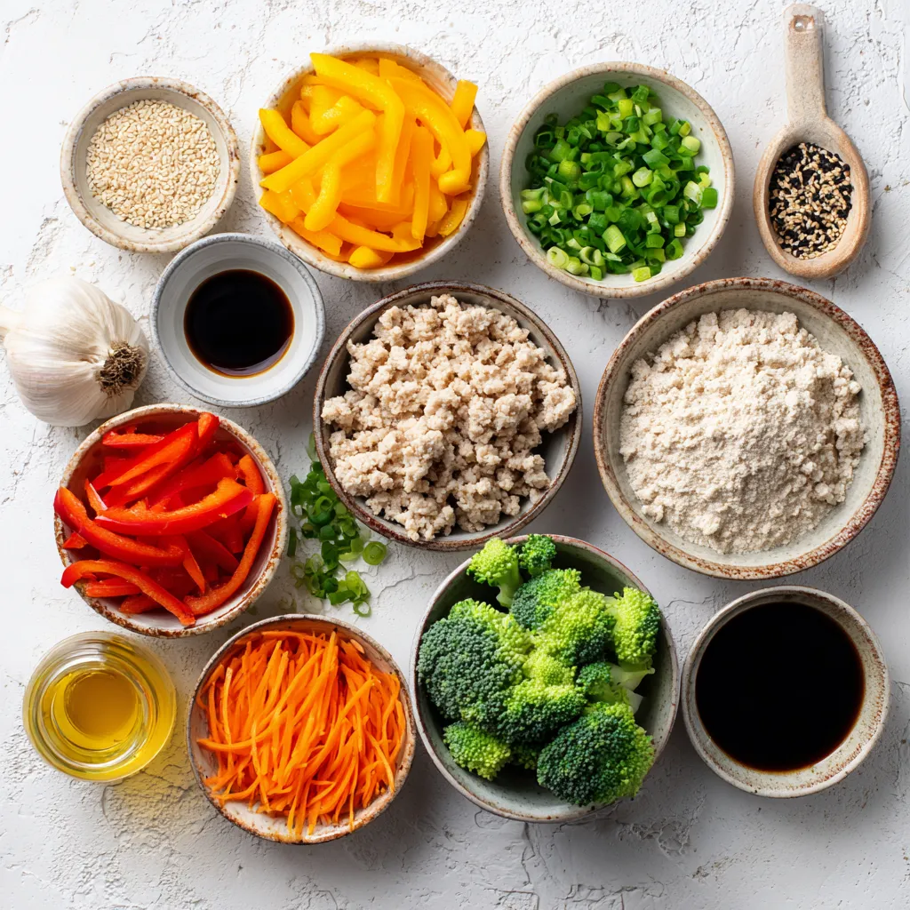 Die Hauptzutaten sind einfach und schnell zu finden. Putenhackfleisch ist mager und bietet eine tolle Basis. Das Gemüse bringt frische Farben und wichtige Nährstoffe. Paprika, Brokkoli und Karotten sorgen für Crunch und Geschmack. Frühlingszwiebeln und Knoblauch fügen eine aromatische Tiefe hinzu. Ingwer gibt eine besondere Note.