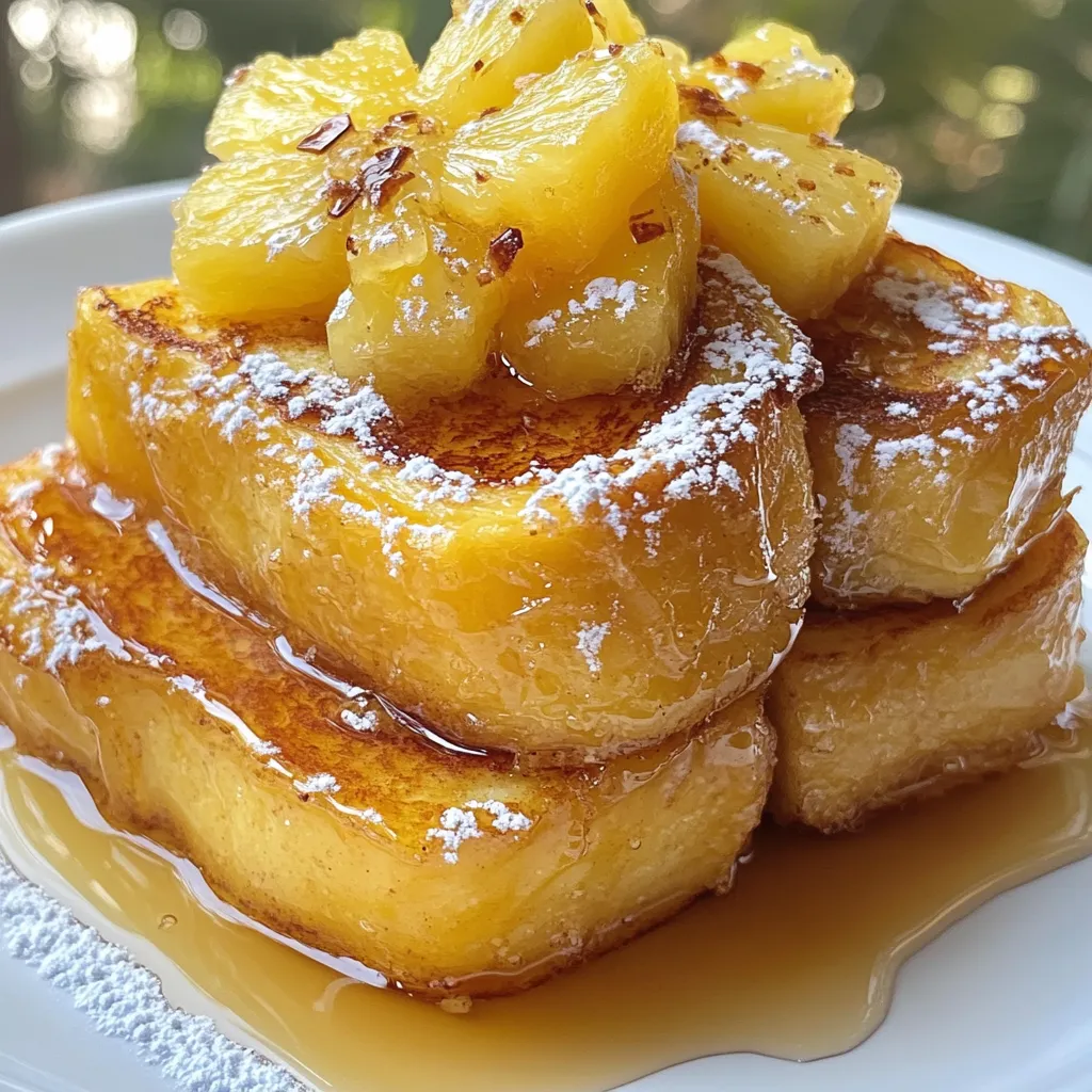 Frische Ananasscheiben bringen die tropische Note. Ahornsirup fügt Süße und Feuchtigkeit hinzu. Puderzucker sieht schön aus und gibt einen süßen Touch. Diese Garnituren machen das Gericht noch besser.