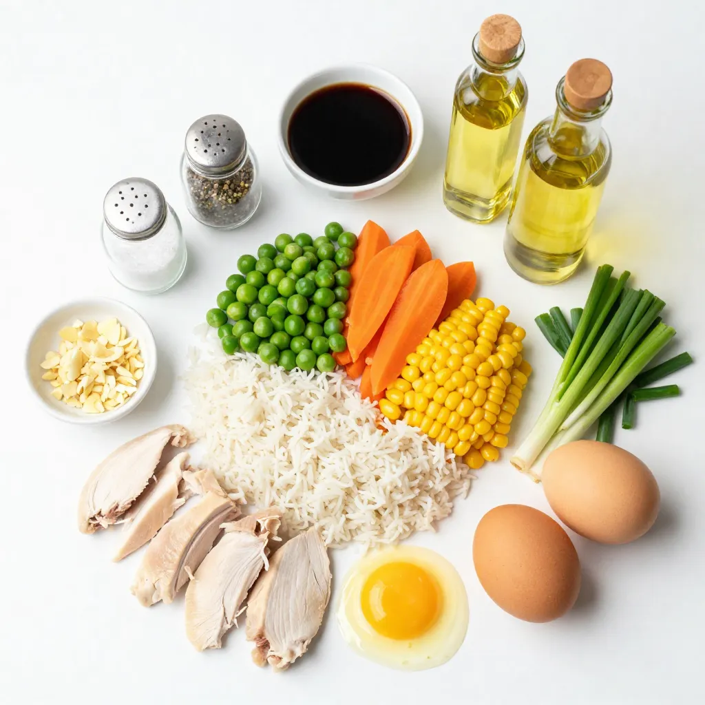 Um Hibachi Chicken Fried Rice zu machen, brauchst du frische und einfache Zutaten. Der gekochte Jasminreis ist wichtig. Er sollte am besten vom Vortag sein. Das macht ihn trocken, was beim Braten hilft. Das Hähnchenbrustfilet ist die Hauptproteinquelle. Es sollte in kleine Würfel geschnitten werden. Das gemischte Gemüse bringt Farbe und Geschmack. Erbsen, Karotten und Mais sind eine großartige Wahl.