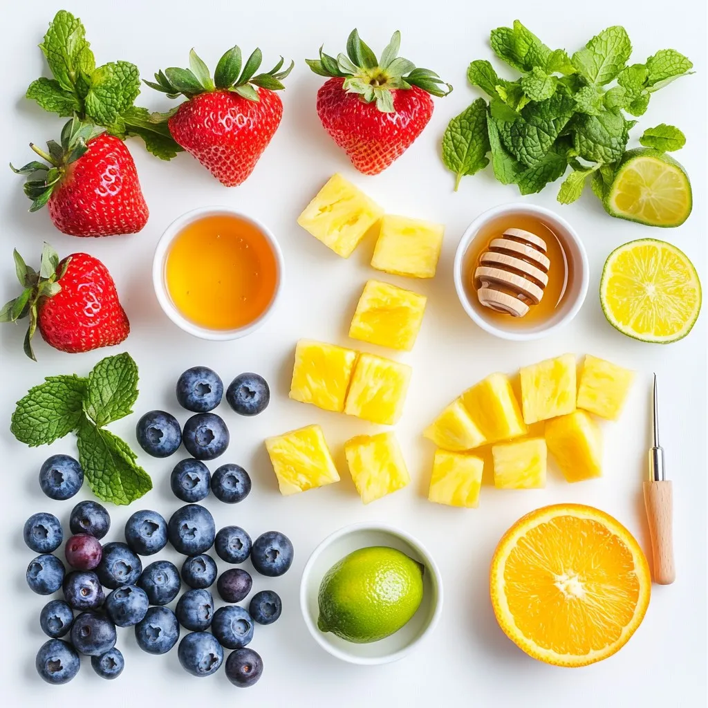 Die Früchte in diesem Salat sind nicht nur lecker, sondern auch gesund. Erdbeeren sind reich an Vitamin C. Blaubeeren sind voll mit Antioxidantien, die gut für das Herz sind. Ananas liefert wichtige Enzyme, die die Verdauung fördern. Orangen bieten viel Flüssigkeit und Vitamin C. Bananen geben dir Energie und sind leicht verdaulich. Minze macht den Salat frisch und kühlend.