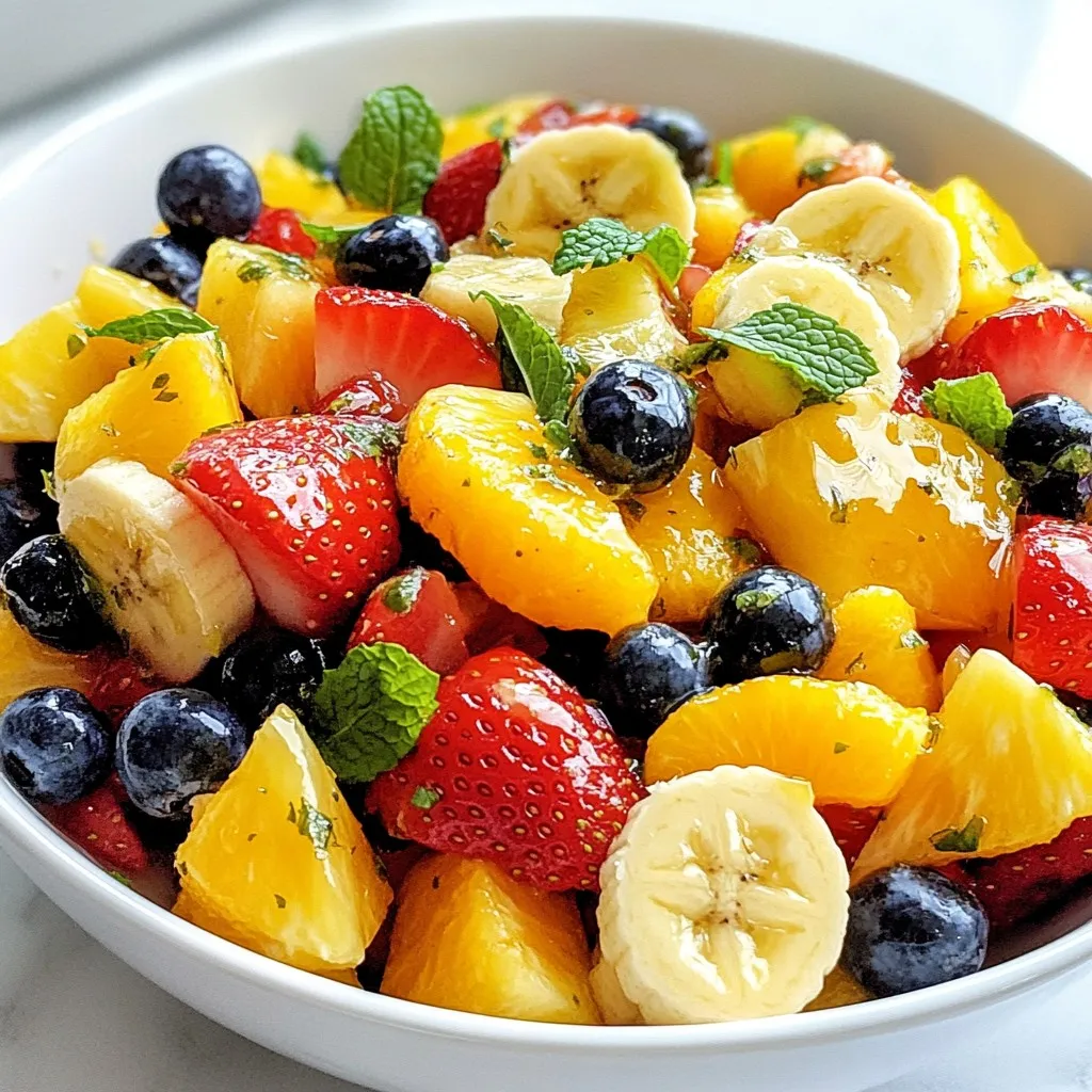 Um die beste Frische zu erhalten, serviere den Salat am besten sofort nach der Zubereitung. Wenn du ihn im Voraus machen musst, lasse das Dressing separat. Mische erst kurz vor dem Servieren die Früchte mit dem Dressing, um die Textur zu bewahren. Eine Prise frische Minze oben drauf gibt einen tollen Kick!