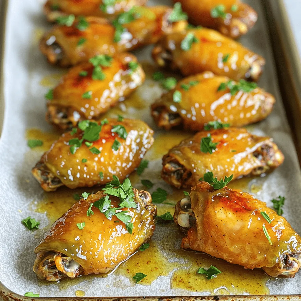 Lege die marinierten Flügel in einer einzigen Schicht auf das Backblech. Achte darauf, dass sie sich nicht überlappen. Backe die Flügel für 25-30 Minuten. Wende sie nach 15 Minuten. So werden sie gleichmäßig knusprig und goldbraun. Lass sie nach dem Backen ein paar Minuten ruhen. Garniere die Flügel mit frischer Petersilie für einen schönen Farbklecks und zusätzlichen Geschmack.