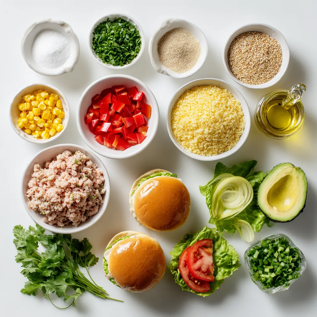 Diese Zutaten bilden die Basis für die Burger. Das gemahlene Hühnchen bringt eine zarte Textur. Der Mais fügt Süße und Crunch hinzu.