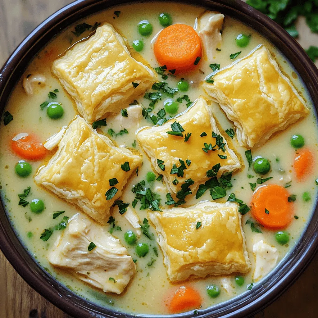 ![Für die Hühnchen-Pot-Pie-Suppe brauchst du einige wichtige Zutaten. Hier sind sie: - 450 g Hühnchenbrust ohne Knochen und Haut, gewürfelt - 500 ml Hühnerbrühe - 240 ml Sahne - 2 Esslöffel Olivenöl - 1 mittlere Zwiebel, gewürfelt - 2 Knoblauchzehen, fein gehackt - 3 Karotten, gewürfelt - 2 Stangen Sellerie, gewürfelt - 150 g gefrorene Erbsen - 60 g Weizenmehl - 280 g Blätterteig oder Biscuit-Teig, in kleine Quadrate geschnitten Diese Zutaten machen die Basis für die Suppe. Sie geben der Suppe einen tollen Geschmack und eine schöne Textur. Die Gewürze bringen das Gericht zum Leben. Ich benutze: - 1 Teelöffel getrockneter Thymian - 1 Teelöffel getrockneter Rosmarin - Salz und Pfeffer nach Geschmack Thymian und Rosmarin sind perfekt für den herzhaften Geschmack. Sie machen die Suppe frisch und aromatisch. Das Topping macht die Suppe besonders lecker. Du kannst folgende Optionen wählen: - Blätterteig für eine knusprige Kruste - Biscuit-Teig für eine weichere Textur Das Topping gibt der Suppe eine schöne Fülle. Du kannst auch frisch gehackte Petersilie oder Thymian darüber streuen. Das verleiht der Suppe Farbe und Frische. Für das vollständige Rezept klicke auf [Full Recipe]. Zuerst bereite alle Zutaten vor. Schneide das Hühnchen in kleine Stücke. Würfle die Zwiebel und den Knoblauch. Schneide die Karotten und den Sellerie ebenfalls klein. So hast du alles griffbereit. Halte die gefrorenen Erbsen bereit. Es ist wichtig, alles vorbereitet zu haben, um den Kochprozess zu erleichtern. Erhitze das Olivenöl in einem großen Topf bei mittlerer Hitze. Gib die Zwiebel und den Knoblauch dazu und brate sie an. Warte, bis die Zwiebel glasig wird, etwa 3-4 Minuten. Dann füge das Hühnchen hinzu und brate es goldbraun an. Das dauert etwa 5-7 Minuten. Danach kommen die Karotten und der Sellerie in den Topf. Koche alles für 4-5 Minuten, bis das Gemüse leicht weich wird. Streue das Mehl darüber und rühre gut um. Lass es für 2 Minuten kochen, um den rohen Geschmack des Mehls zu entfernen. Gieße langsam die Hühnerbrühe hinein und rühre ständig. So vermeidest du Klumpen. Bring die Mischung zum Simmern. Füge nun die Sahne, den Thymian und den Rosmarin hinzu. Schmecke die Suppe mit Salz und Pfeffer ab. Rühre die gefrorenen Erbsen unter. Reduziere die Hitze und lass die Suppe 15-20 Minuten köcheln. So entfalten sich die Aromen und die Suppe dickt etwas ein. Bereite währenddessen dein Teig-Topping vor. Wenn die Suppe fertig ist, fülle sie in ofenfeste Schalen. Lege die Teigstücke obenauf und backe sie goldbraun. Jetzt hast du eine leckere Hühnchen-Pot-Pie-Suppe! Sie ist herzhaft und einfach gemacht. Du kannst das vollständige Rezept [hier] finden. Um die beste Hühnchen-Pot-Pie-Suppe zu machen, sind einige Tipps wichtig. Achte darauf, frische Zutaten zu verwenden. Sie geben der Suppe mehr Geschmack. Schneide das Hühnchen klein, damit es gleichmäßig gar wird. Koche die Suppe langsam, damit sich die Aromen gut verbinden. Ein häufiger Fehler ist, die Brühe zu schnell hinzuzufügen. Das kann Klumpen bilden. Gieße die Brühe langsam hinein und rühre ständig. Einige ziehen es vor, die Erbsen früher hinzuzufügen. Dies kann dazu führen, dass sie matschig werden. Füge sie lieber am Ende hinzu. Die besten Methoden sind einfach. Koche die Zwiebeln und den Knoblauch zuerst. Dies bringt mehr Geschmack. Verwende auch hochwertige Brühe. Wenn du die Sahne hinzufügst, rühre gut um. So wird die Suppe schön cremig. Denke daran, die Suppe regelmäßig zu probieren und nach Geschmack zu würzen. Für das perfekte Topping kannst du Blätterteig oder Biscuit-Teig verwenden. Folge den Anweisungen auf der Packung für beste Ergebnisse. Du kannst die Suppe in ofenfeste Schalen füllen und den Teig darauflegen. Backe sie, bis sie goldbraun sind. Für das vollständige Rezept, schau dir die [Full Recipe] an. {{image_4}} Um eine vegetarische oder vegane Hühnchen-Pot-Pie-Suppe zu machen, ersetze das Hühnchen. Verwende stattdessen gewürfelten Tofu oder Seitan. Du kannst auch Kichererbsen oder Linsen für Protein nutzen. Ersetze die Hühnerbrühe durch Gemüsebrühe und die Sahne durch Kokosmilch oder pflanzliche Sahne. Diese Änderungen geben der Suppe einen leckeren Geschmack. Du kannst viele verschiedene Gemüse hinzufügen. Zucchini, Paprika oder grüne Bohnen passen gut. Auch Kartoffeln machen die Suppe herzhaft. Füge sie einfach zusammen mit den Karotten und dem Sellerie hinzu. Für mehr Geschmack kannst du frische Kräuter wie Petersilie oder Basilikum verwenden. Diese geben der Suppe eine frische Note. Bei den Teigarten gibt es viele Optionen. Blätterteig gibt eine knusprige Kruste und ist klassisch. Biscuit-Teig ist fluffig und einfach zu machen. Du kannst auch Pizzateig verwenden, wenn du eine dickere Kruste möchtest. Jedes Teigstück gibt der Suppe eine andere Textur und Geschmack. Wähle, was dir am besten gefällt! Für die besten Ergebnisse verwende das [Full Recipe] und experimentiere mit diesen Variationen. Du kannst Hühnchen-Pot-Pie-Suppe einfach aufbewahren. Lass die Suppe zuerst abkühlen. Fülle sie dann in einen luftdichten Behälter. Stelle sicher, dass der Behälter sauber ist. Die Suppe bleibt im Kühlschrank bis zu drei Tage frisch. Wenn du mehr Suppe hast, friere sie ein. Verwende gefrierfreundliche Behälter oder Beutel. Fülle sie nicht ganz bis zum Rand, da die Suppe sich ausdehnt. So bleibt der Geschmack auch nach dem Einfrieren gut. Die Suppe kann bis zu drei Monate im Gefrierfach bleiben. Um die Suppe aufzuwärmen, stelle sie in einen Topf. Erwärme sie bei niedriger Hitze und rühre häufig. Füge etwas Brühe oder Wasser hinzu, wenn sie zu dick wird. Du kannst die Suppe auch in der Mikrowelle erhitzen. Achte darauf, sie in Intervallen zu wärmen und zwischendurch umzurühren, um gleichmäßige Wärme zu bekommen. Damit bleibt die Suppe lecker und cremig. Hühnchen-Pot-Pie-Suppe bleibt frisch im Kühlschrank für etwa 3 bis 4 Tage. Achte dar