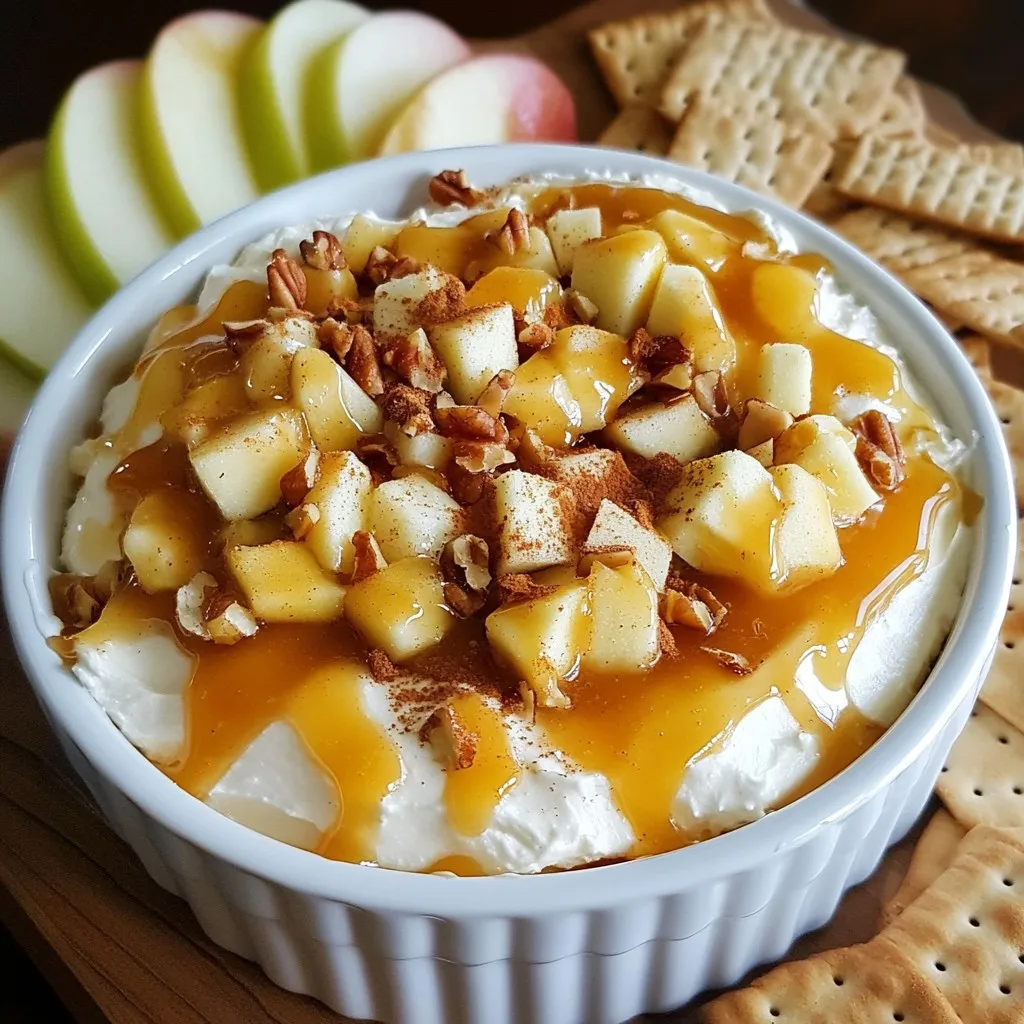 Ein cremiger Dip mit Frischkäse, Äpfeln und Karamellsauce, perfekt zum Servieren mit Apfelscheiben und Graham-Crackern.