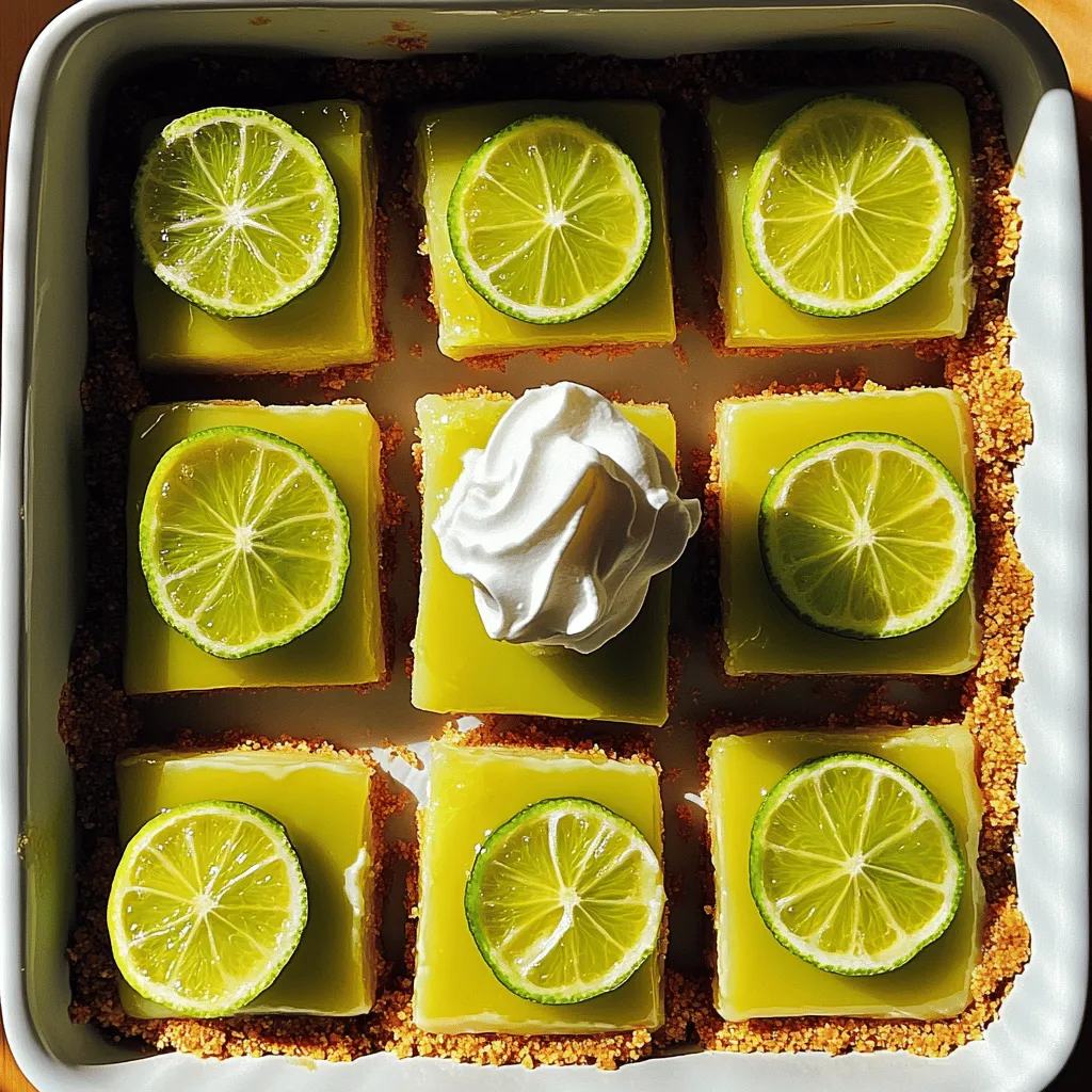 - 1 ½ Tassen Graham-Cracker-Brösel - ½ Tasse ungesalzene Butter, geschmolzen - ⅓ Tasse Kristallzucker Ich beginne mit den Hauptzutaten. Die Graham-Cracker-Brösel geben der Kruste einen knusprigen Biss. Durch das Mischen mit geschmolzener Butter wird die Kruste lecker und fest. Kristallzucker sorgt dafür, dass alles süß und harmonisch schmeckt. - 2 große Eier - 1 Tasse gesüßte Kondensmilch - ½ Tasse frisch gepresster Key-Limettensaft - Schale von 2 Key-Limetten Die Füllung macht die Bars frisch und cremig. Die Eier binden die Mischung. Gesüßte Kondensmilch bringt den süßen Geschmack. Key-Limettensaft und die Schale geben das besondere Aroma. Sie machen die Bars lebendig und köstlich. - Schlagsahne - Limettenscheiben Für die Garnierung nutze ich gern Schlagsahne. Sie bringt eine schöne Cremigkeit. Limettenscheiben sind ein toller Hingucker. Sie verleihen den Bars einen frischen Look und zusätzlichen Geschmack. Wenn du die volle Frische willst, sind diese Garnierungen perfekt. Für die genauen Mengen und die Zubereitung schau dir das vollständige Rezept an. Zuerst heizen Sie Ihren Ofen auf 175°C (350°F) vor. Dies sorgt dafür, dass die Kruste gleichmäßig backt. Bereiten Sie dann eine 20x20 cm (8x8 Zoll) Backform vor. Fetten Sie die Form gut ein, damit die Riegel später leicht herauskommen. Für die Kruste vermischen Sie 1 ½ Tassen Graham-Cracker-Brösel mit ½ Tasse geschmolzener Butter und ⅓ Tasse Kristallzucker. Rühren Sie die Mischung, bis alles gut vermengt ist. Die Mischung sollte feucht und sandig aussehen. Übertragen Sie die Krustenmischung in die vorbereitete Backform. Drücken Sie die Mischung gleichmäßig auf den Boden der Form. Das sorgt für eine feste und knusprige Basis. Jetzt machen wir die Füllung. Nehmen Sie eine mittlere Schüssel und vermischen Sie 2 große Eier, 1 Tasse gesüßte Kondensmilch, ½ Tasse frisch gepressten Key-Limettensaft, die Schale von 2 Key-Limetten und ¼ Teelöffel Salz. Schlagen Sie alles gut zusammen, bis die Mischung glatt ist. Gießen Sie die Füllung vorsichtig über die abgekühlte Kruste. Verteilen Sie sie gleichmäßig, damit jeder Bissen lecker ist. Für die gesamte Zubereitung können Sie das detaillierte Rezept in der [Full Recipe] nachlesen. Um die Kruste richtig zu drücken, ist es wichtig, eine gleichmäßige Schicht zu bilden. Verwenden Sie den Boden eines Glases oder eine kleine Schüssel, um die Mischung in die Form zu drücken. Drücken Sie fest, damit die Kruste nicht bröckelt. Um brüchige Ränder zu vermeiden, verwenden Sie genug geschmolzene Butter. Diese sorgt für die nötige Bindung. Achten Sie darauf, die Kruste vor dem Backen gut zu backen. So wird sie fest und knusprig. Überprüfen Sie die Konsistenz der Füllung, indem Sie sie gut verquirlen. Sie sollte glatt und cremig sein. Klumpen können die Textur stören. Um das Wackeln zu testen, nehmen Sie die Form vorsichtig aus dem Ofen. Die Füllung sollte in der Mitte leicht wackeln. Das zeigt, dass sie noch cremig bleibt, wenn sie abkühlt. Garnieren Sie die Riegel optimal mit Schlagsahne. Ein Klecks obenauf macht sie lecker und schön. Fügen Sie einige Limettenscheiben hinzu, um Farbe und Geschmack zu steigern. Bewahren Sie die Riegel in einer luftdichten Box auf. So bleiben sie frisch und schmackhaft. Stellen Sie sicher, dass sie gut gekühlt sind, bevor Sie sie servieren. {{image_4}} Du kannst die Füllung für deine Key Lime Pie Bars variieren. Eine tolle Idee ist die Verwendung anderer Zitrusfrüchte. Probiere zum Beispiel Zitronen oder Orangen. Diese Früchte geben einen neuen Geschmack, der frisch und lecker ist. Du kannst auch aromatisierte Extrakte hinzufügen. Ein paar Tropfen Vanille oder Mandelessenz können die Füllung bereichern. Diese kleinen Änderungen machen viel aus! Falls du eine glutenfreie Option möchtest, kannst du die Graham-Cracker-Brösel ersetzen. Verwende einfach glutenfreie Kekse oder Haferflocken. Mahle sie gut und mische sie mit Butter und Zucker. So bleibt die Kruste knusprig und lecker, ohne Gluten. Diese Anpassung macht das Rezept für alle zugänglich. Für eine vegane Version brauchst du Eiersubstitute und pflanzliche Kondensmilch. Du kannst zum Beispiel Leinsamen oder Chiasamen verwenden. Mische 1 Esslöffel Leinsamen mit 3 Esslöffeln Wasser. Lass es etwa 5 Minuten stehen, bis es dick wird. Verwende dann pflanzliche Kondensmilch anstelle der normalen. So bleiben die Bars cremig und lecker, ohne tierische Produkte. Für das vollständige Rezept, schau dir die [Full Recipe] an. Key Lime Pie Bars halten sich im Kühlschrank bis zu einer Woche. Legen Sie die Riegel in einen luftdichten Behälter. Stellen Sie sicher, dass sie nicht direkt mit Luft in Kontakt kommen. So bleibt die Frische erhalten. Um die Riegel einzufrieren, schneiden Sie sie zuerst in Portionen. Wickeln Sie jede Portion in Frischhaltefolie ein. Legen Sie die eingewickelten Riegel in einen gefrierfesten Beutel. Zum Auftauen legen Sie die Riegel einfach in den Kühlschrank. Lassen Sie sie overnight auftauen. Wenn Sie die Riegel servieren, lassen Sie sie kurz bei Zimmertemperatur ruhen. So wird die Textur schön cremig. Für einen warmen Genuss können Sie die Riegel für einige Minuten bei 150°C im Ofen erwärmen. Dies bringt die Aromen richtig zur Geltung. Die Key Lime Pie Bars brauchen etwa 2 Stunden, um richtig abzukühlen. Zuerst lassen Sie sie bei Zimmertemperatur stehen. Danach stellen Sie sie in den Kühlschrank. Wenn Sie es eilig haben, können Sie die Form in den Kühlschrank stellen, um den Prozess zu beschleunigen. Verwenden Sie einen großen, flachen Teller, um die Kälte gleichmäßig zu verteilen. Ja, Sie können frischen Limettensaft ersetzen. Verwenden Sie normalen Limettensaft oder sogar Limettensaft aus der Flasche. Beachten Sie, dass der Geschmack etwas anders sein kann. Frischer Saft hat oft mehr Aroma und einen lebhafteren Geschmack. Wenn Sie frischen Saft verwenden, wählen Sie reife, saftige Limetten für die beste 