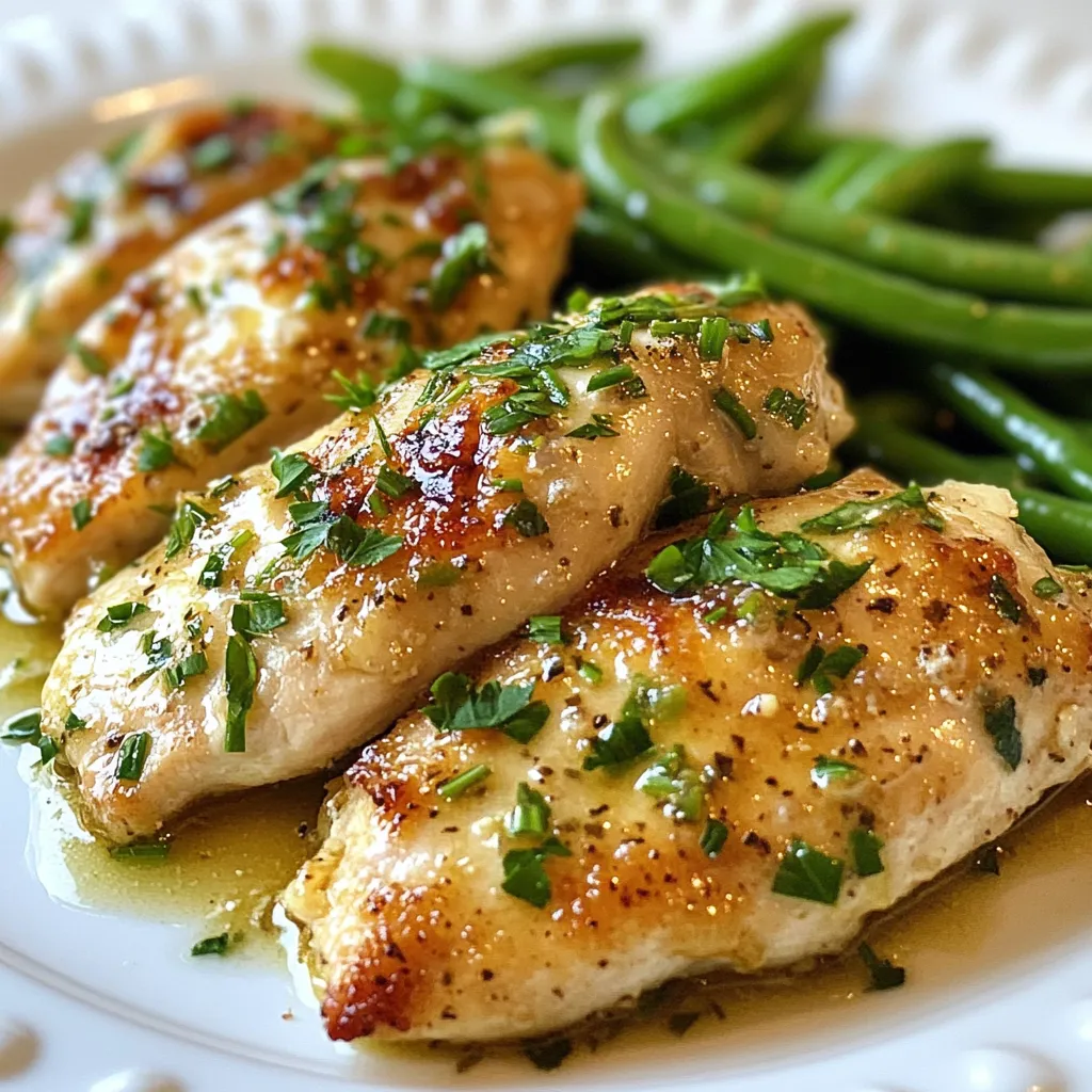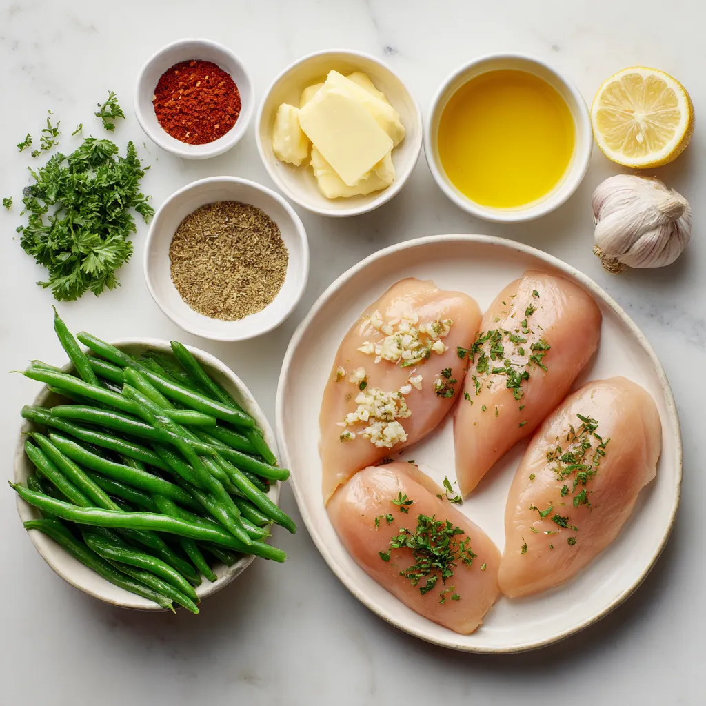 Ein köstliches Hähnchengericht mit aromatischer Knoblauchbutter und knackigen grünen Bohnen.