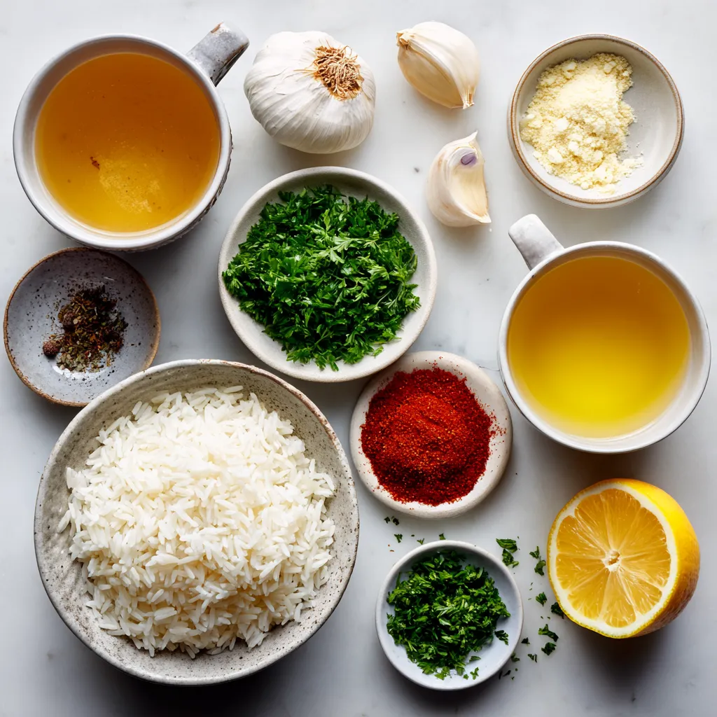 Für diesen tollen Knoblauchbutter-Reis brauchst du ein paar wichtige Zutaten: