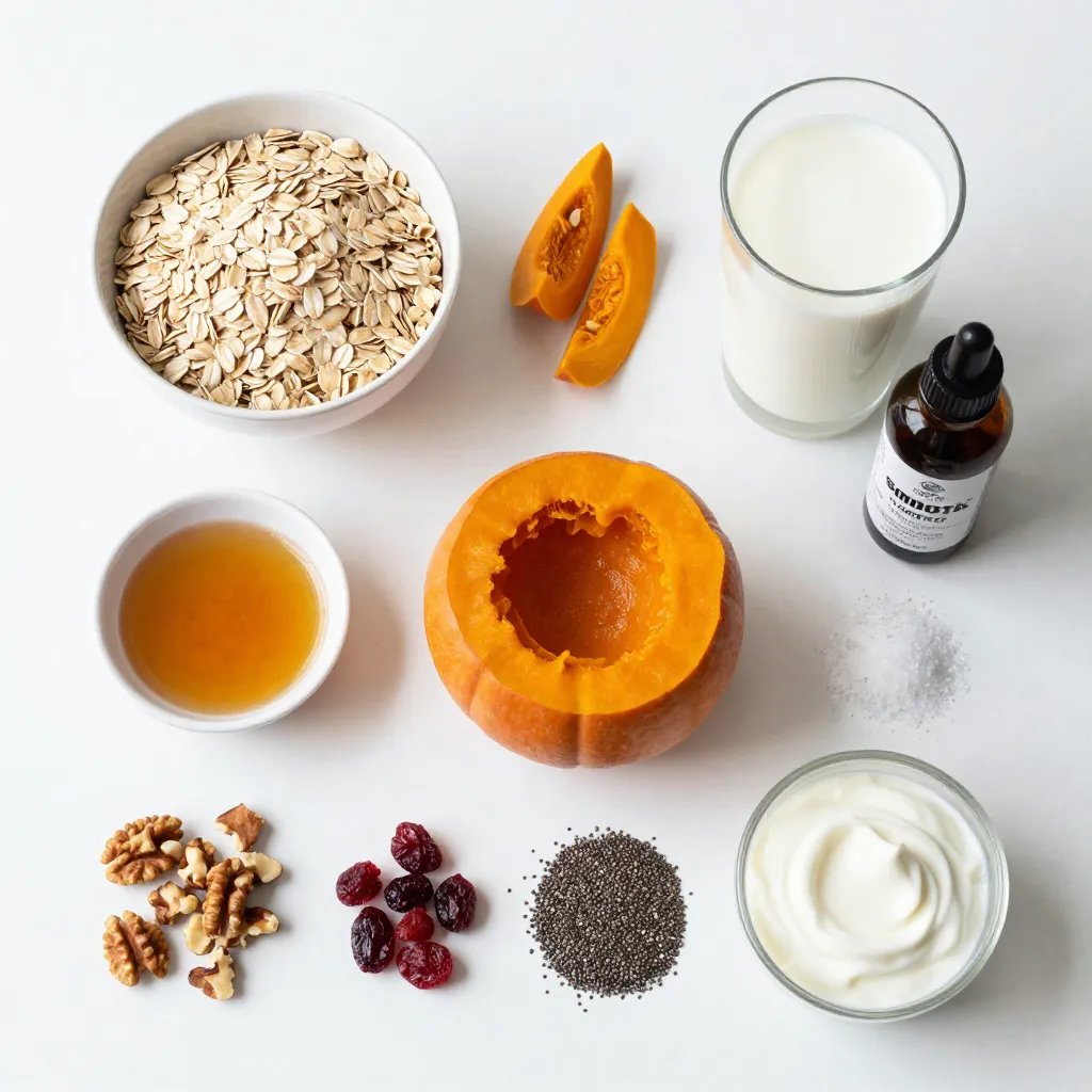 Hauptzutaten für Kürbisgewürz Übernacht Haferflocken