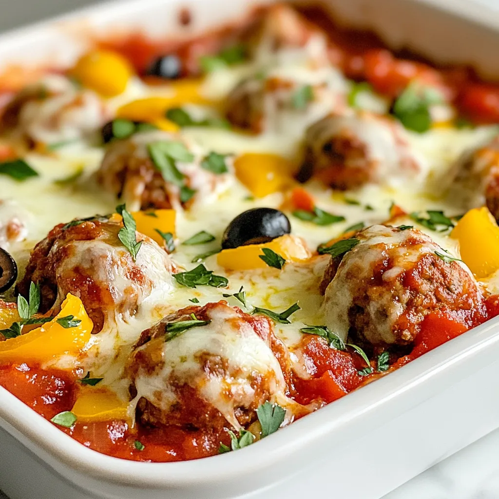 - Zutaten Kombinieren: Verteilen Sie in einer großen Auflaufform eine dünne Schicht Marinara-Sauce auf dem Boden. Legen Sie die gebackenen Fleischbällchen gleichmäßig darüber, gefolgt von den angebratenen Paprikawürfeln und Oliven. Gießen Sie die restliche Marinara-Sauce über die Fleischbällchen und das Gemüse.