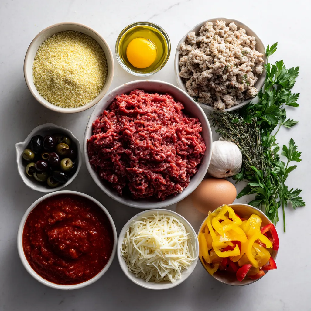 Heize deinen Ofen auf 190°C vor. Das sorgt dafür, dass der Auflauf gleichmäßig gart. Bereite alle Zutaten vor, damit du schnell arbeiten kannst. Du brauchst gemischtes Hackfleisch, Semmelbrösel, Parmesan, ein Ei, Knoblauch, Oregano, Basilikum, Salz, Pfeffer, Marinara-Sauce, Mozzarella, Paprika, Oliven und frische Petersilie.