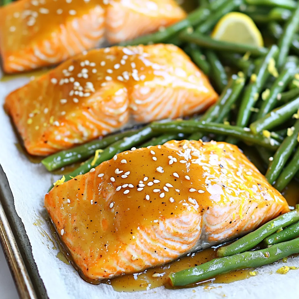 Legen die Lachsfilets auf eine Seite des Backblechs. Bestreiche jeden Lachsfilet großzügig mit der Marinade, sodass alles gut bedeckt ist. In einer separaten Schüssel vermischst du 450 g frische grüne Bohnen mit 3 fein gehackten Knoblauchzehen, einem Spritzer Olivenöl und etwas Salz und Pfeffer. Mische alles gut. Verteile die gewürzten Bohnen auf der anderen Seite des Backblechs.