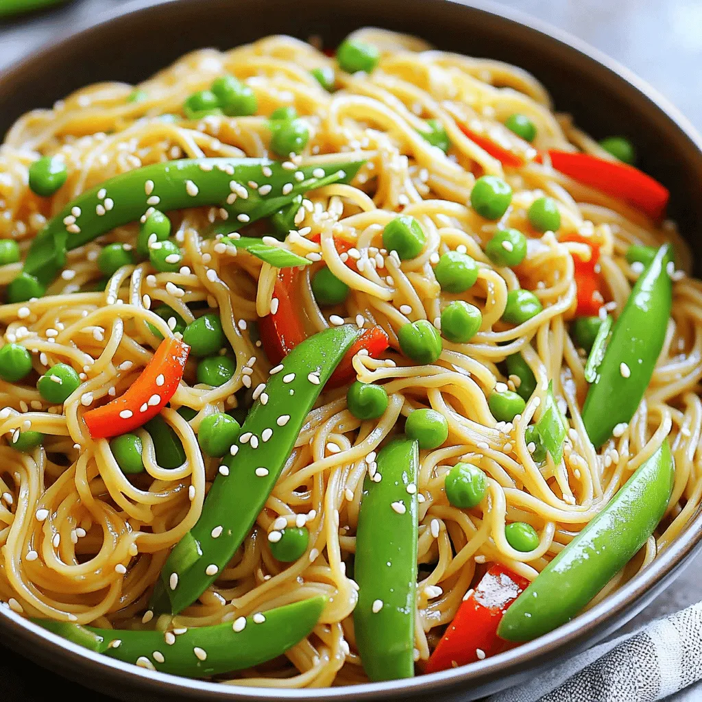 Zuckerschoten sind knackig und süß. Sie sorgen für eine schöne Textur. Rote Paprika bringt Farbe und Vitamine. Frühlingszwiebeln fügen einen milden Zwiebelgeschmack hinzu. Zusammen machen sie die Nudeln bunt und gesund.