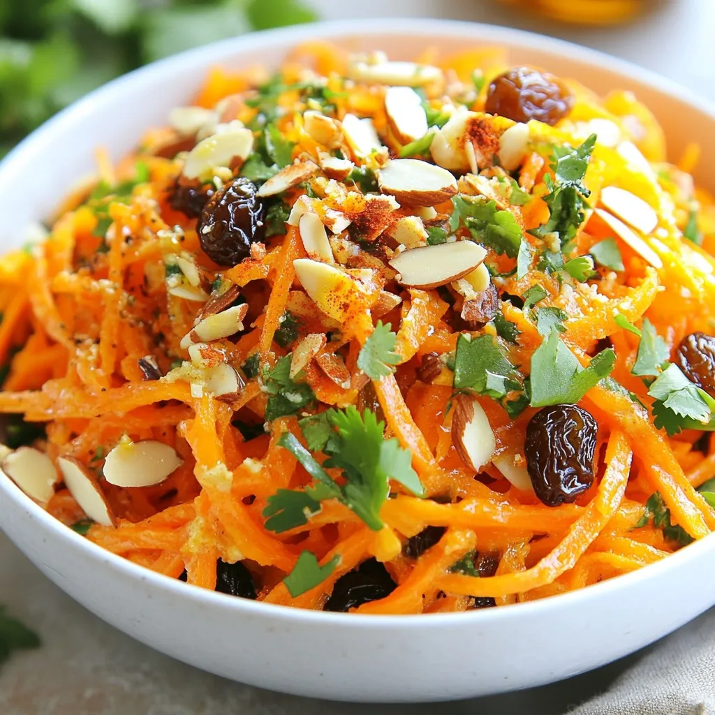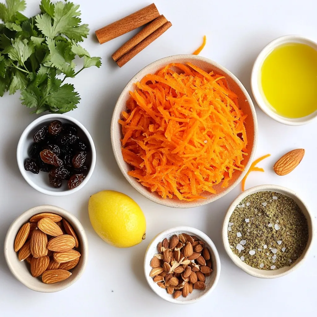 Wenn du die Zutaten vorbereiten möchtest, schäle und reibe die Karotten. Röste die Mandeln im Voraus und bewahre sie in einem Behälter auf. Halte die Rosinen und den Koriander bereit. So sparst du Zeit und kannst schnell genießen.