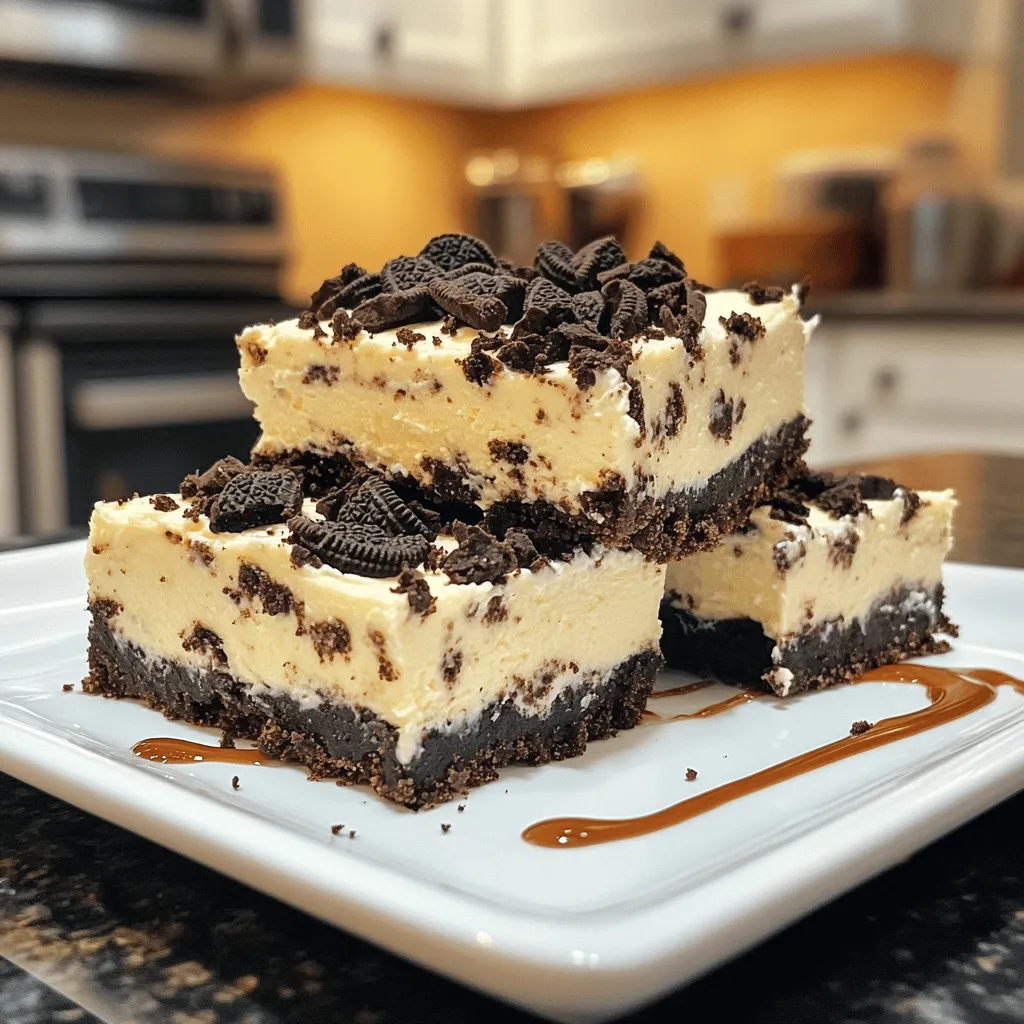 Serviere die Käsekuchenriegel auf einem schönen Dessertteller. Garniere sie mit zusätzlichen Oreobröseln und frischen Beeren. Das sorgt für einen tollen visuellen Kontrast. Ein Tropfen Schokoladensirup auf jedem Stück macht das Dessert noch ansprechender. Denk daran, die Riegel gleichmäßig zu schneiden, um eine schöne Form zu erhalten.