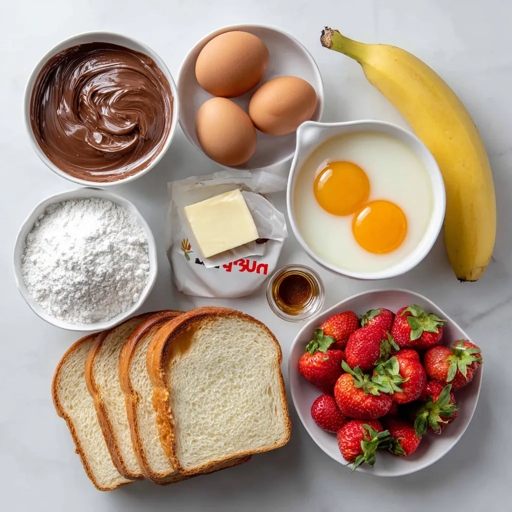 Diese Zutaten sind die Basis für deinen Nutella Stuffed French Toast. Die Kombination aus frischem Brot und cremiger Nutella sorgt für einen köstlichen Biss.