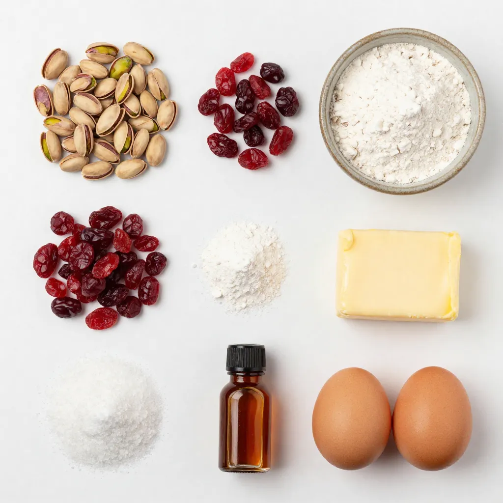 Hauptzutaten für Pistazien-Cranberry-Biscotti