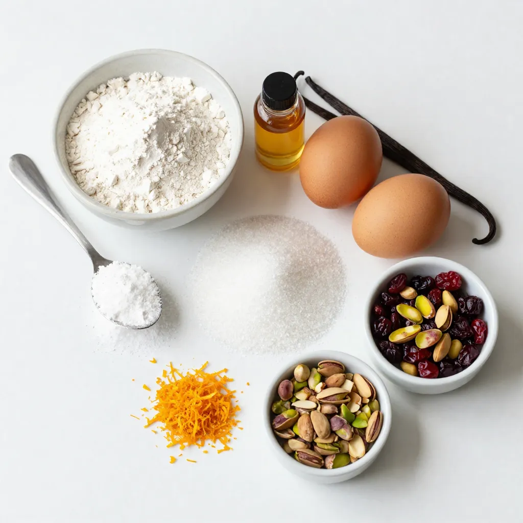 Hauptzutaten für Pistazien-Cranberry-Biscotti