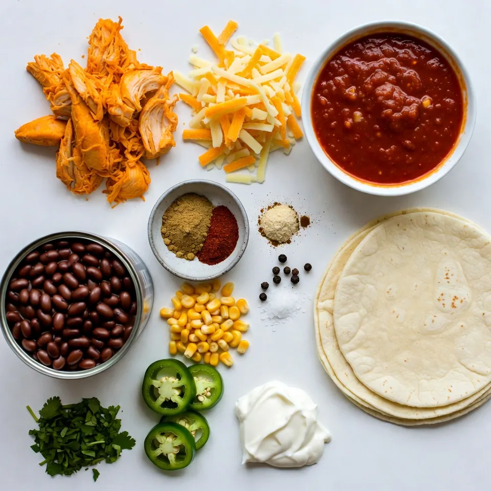 Diese Zutaten bilden die Basis für ein schnelles und köstliches Gericht. Das zerkleinerte Hühnchen ist einfach zuzubereiten und gibt viel Geschmack. Die Tortillas halten die Füllung zusammen und sorgen für eine tolle Textur.