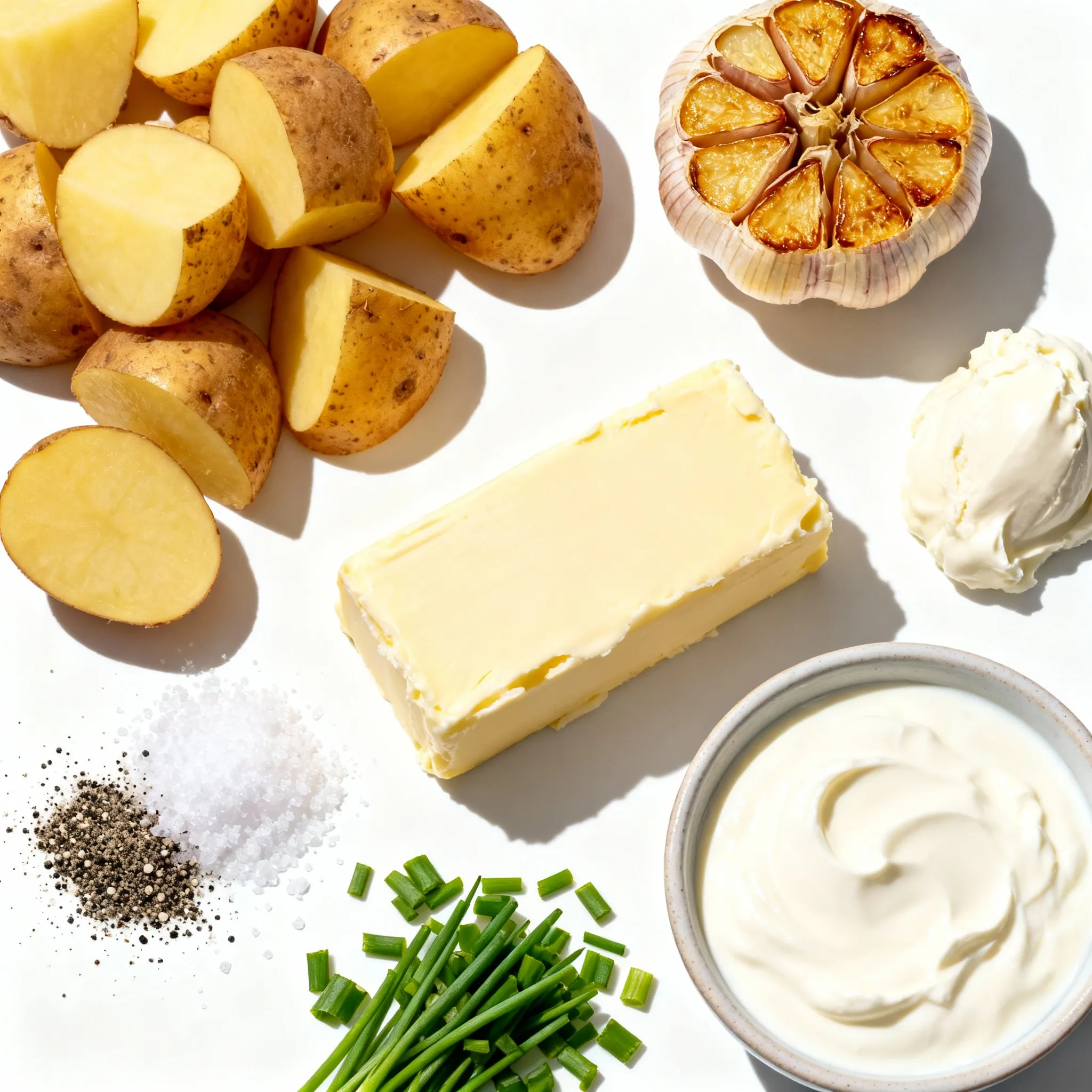 Die Hauptzutaten sind einfach und leicht zu finden. Russet-Kartoffeln sind ideal, weil sie viel Stärke haben. Dadurch wird der Kartoffelbrei schön cremig. Die Knoblauchknolle gibt dem Gericht einen tollen Geschmack.